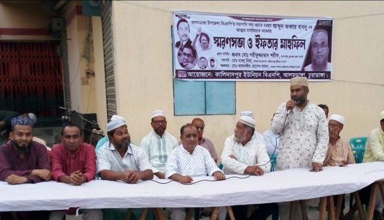 স্টাফ রিপোর্টার: আলমডাঙ্গা উপজেলার হারদী ও কালিদাসপুর ইউনিয়ন বিএনপির স্বরণসভা ও ইফতার মাহাফিল অনুষ্ঠিত হয়েছে। গতকাল বুধবার আলমডাঙ্গার হারদী ও কালিদাসপুর ইউনিয়ন বিএনপির পৃথকভাবে এ অনুষ্ঠানের আয়োজন করা হয়। অনুষ্ঠানে আলমডাঙ্গা উপজেলা বিএনপির সভাপতি প্রয়াত আব্দুল জব্বার বাবলুর আত্মার মাগফিরাত কামনা করা হয়। সভাপতিত্ব করেন হারদী ইউনিয়ন বিএনপির সভাপতি মোব্বাশেরুজ্জামান খান প্রবাস ও কালিদাসপুর ইউনিয়ন বিএনপির সিনিয়র সহ সভাপতি বাবলু মিয়া। পৃথক দুটি অনুষ্ঠানে প্রধান অতিথি ছিলেন জেলা বিএনপির সদস্য সচিব মো. শরীফুজ্জামান শরীফ। বিশেষ অতিথি ছিলেন জেলা বিএনপির সদস্য আবু বকর সিদ্দিক আবু, আলমডাঙ্গা পৌর বিএনপির সভাপতি মো. আজিজুর রহমান পিন্টু, জেলা বিএনপির সদস্য মির্জা ফরিদুল ইসলাম শিপলু, আলমডাঙ্গা পৌর বিএনপির সাধারণ সম্পাদক মো. জিল্লুর রহমান ওল্টু, আলমডাঙ্গা উপজেলা বিএনপির সিনিয়র সহ সভাপতি মো. আখতার হেসেন জোয়াদ্দার, আলমডাঙ্গা উপজেলার বিএনপির সাংগঠনিক সম্পাদক মো. আনোয়ার হোসেন, গোলাম হোসেন, আলমডাঙ্গা উপজেলা বিএনপির নেতা এমদাদুল হক ডাবু, জেলা সেচ্ছাসেবকদলের সভাপতি শফিকুল ইসলাম পিটু, জেলা জাসাসের সাধারণ সম্পাদক মো. সেলিমুল হাবিব সেলিম, সদর উপজেলা বিএনপির যুগ্ম সম্পাদক মো. আবুল কামাল আজাদ, হারদী ইউনিয়ন বিএনপি সাধারণ সম্পাদক মো. শফিকুল ইসলাম ও কালিদাসপুর ইউনিয়ন বিএনপির সাধারণ সম্পাদক মো. আলমগীর হোসেন লালন এর সঞ্চালনায় আরও উপস্থিত ছিলেন জেলা ছাত্রদলের যুগ্ম সম্পাদক মো. আমানউল্লাহ আমান, আরিফ আহমেদ শিপ্লব, আলমডাঙ্গা উপজেলা যুবদলের সদস্য সচিব মো. রফিকুল ইসলাম, পৌর সদস্য সচিব মো. সাইফুল আলম কনক, আলমডাঙ্গা উপজেলার ছাত্রদলের সভাপতি জাহিদ হাসান শুভ, চুয়াডাঙ্গা পৌর ছাত্রদলের সদস্য সচিব মাজেদুল আলম মেহেদী, শাহারুজ্জামান শাহারু প্রমুখ।