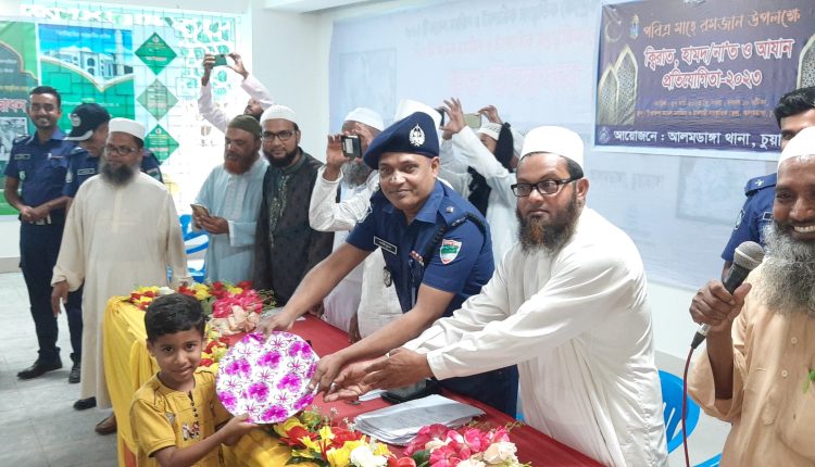 আলমডাঙ্গা ব্যুরো: আলমডাঙ্গায় পবিত্র মাহে রমজান উপলক্ষে থানা পুলিশের আয়োজনে ক্বিরাত, হামদ/না’ত ও আজান প্রতিযোগিতা-২০২৩ অনুষ্ঠিত হয়েছে। ২৭ মার্চ আলমডাঙ্গা মডেল মসজিদ ও ইসলামী সাংস্কৃতিক কেন্দ্রে এ প্রতিযোগিতা অনুষ্ঠিত হয়। ক্বিরাত, হামদ/না’ত ও আযান প্রতিযোগিতায় উপজেলার বিভিন্ন শিক্ষা প্রতিষ্ঠানের শিক্ষার্থীরা অংশগ্রহণ করে। সকাল ১০টা থেকে শুরু হয়ে বিকেল সাড়ে ৩টা পর্যন্ত ক, খ, গ ৩টি গ্রুপে চলে এ প্রতিযোগিতা। পরে প্রতিযোগিতায় অংশ গ্রহণ করে বিজয়ীদের মাঝে পুরস্কার বিতরণ করা হয়। আলমডাঙ্গা থানার অফিসার ইনচার্জ সাইফুল ইসলামের সভাপতিত্বে বিচারক হিসেবে ও পুরস্কার বিতরণী অনুষ্ঠানে উপস্থিত ছিলেন আলমডাঙ্গা থানার পুলিশ পরিদর্শক (অপারেশন) একরামুল হোসাইন, আলমডাঙ্গা সিদ্দিকীয়া আলিম মাদরাসার অধ্যক্ষ মাওলানা সিরাজুল ইসলাম, নওলামারী আলিম মাদরাসার অধ্যক্ষ মাওলানা আব্দুল লতিফ, আলমডাঙ্গা সরকারি কলেজের প্রভাষক জামাল উদ্দিন, নওলামারি আলিম মাদরাসার প্রভাষক মাওলানা সোলায়মান কবীর, মাওলানা সাইফুল ইসলাম, আলমডাঙ্গা একাডেমির শিক্ষক শাহিদ শাহিন, বকশিপুর দাখিল মাদরাসার সুপার মাওলানা শরিয়তুল ইসলাম, আলমডাঙ্গা মডেল মসজিদের ইমাম মাওলানা মাসুদ কামাল, ইসলামিক ফাউন্ডেশনের সুপারভাইজার আক্তারুজ্জামান, মডেল কেয়ারটেকার মাওলানা ওমর ফারুক। এছাড়াও উপস্থিত ছিলেন এসআই সালাহ উদ্দিন, এসআই আশিক, এএসআই রিয়াজুল, এএসআই শিউলি খাতুন প্রমুখ। বিজয়ীদের চুয়াডাঙ্গা পুলিশ লাইনে পুলিশ সুপারের আয়োজনে ক্বিরাত, হামদ/না’ত ও আযান প্রতিযোগিতায় অংশগ্রহণ করার জন্য নিয়ে যাওয়া হবে।