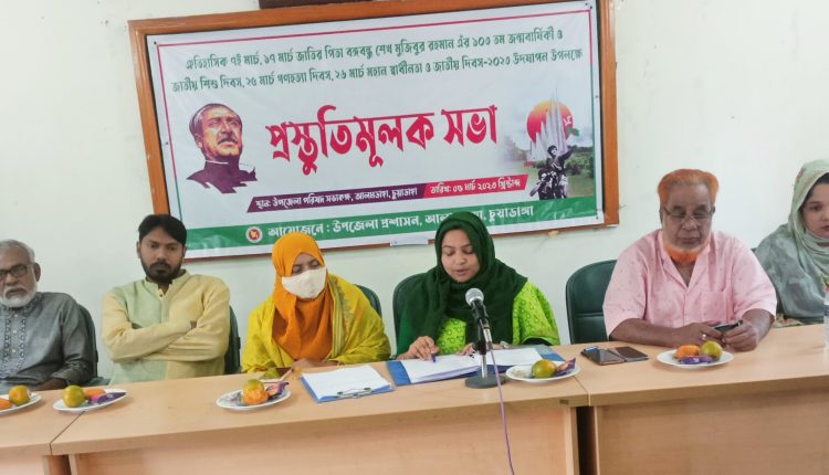 আলমডাঙ্গা ব্যুরো: আলমডাঙ্গা উপজেলা প্রশাসনের উদ্যোগে ৭ মার্চ, ১৭ মার্চ, ২৫ মার্চ ও ২৬ মার্চ জাতীয় দিবস উদযাপন উপলক্ষে প্রস্তুতিসভা অনুষ্ঠিত হয়েছে। ৫ মার্চ বিকেল তিনটায় উপজেলা পরিষদ মিলনায়তনে প্রস্তুতিসভা অনুষ্ঠিত হয়। সভায় সহকারী কমিশনার (ভূমি) ও উপজেলা নির্বাহী অফিসার (অ.দা.) রেজওয়ানা নাহিদের সভাপতিত্বে প্রধান অতিথি ছিলেন উপজেলা পরিষদের ভাইস চেয়ারম্যান অ্যাডভোকেট খন্দকার সালমুন আহমেদ ডন। বিশেষ অতিথি ছিলেন মহিলা ভাইস চেয়ারম্যান কাজী মারজাহান নিতু, জেলা আ.লীগের সাবেক বন ও পরিবেশ বিষয়ক সম্পাদক শহিদুল ইসলাম খান, আলমডাঙ্গা পৌরসভার সাবেক চেয়ারম্যান বীর মুক্তিযোদ্ধা এম সবেদ আলী, ৭০’র অগ্নিসেনা বীর মুক্তিযোদ্ধা মঈন উদ্দিন পারভেজ, বীর মুক্তিযোদ্ধা আলহাজ শেখ নূর মোহাম্মদ জকু, বীর মুক্তিযোদ্ধা ডাক্তার লিয়াকত আলী, উপজেলা স্বাস্থ্য কমপ্লেক্সের সহকারী সার্জন ডাক্তার শারমিন আক্তার, আলমডাঙ্গা থানার পুলিশ পরিদর্শক (অপারেশন) একরামুল হোসাইন, মাধ্যমিক শিক্ষা অফিসার ফজলুল হক। কলেজিয়েট স্কুলের উপাধ্যক্ষ শামীম রেজার উপস্থাপনায় উপস্থিত ছিলেন প্রাণিসম্পদ কর্মকর্তা আব্দুল্লাহিল কাফি, মৎস্য অফিসার ফাতেমা কামরুন নাহার আঁখি, বিআরডিপি কর্মকর্তা সাইলা শারমিন, বণিক সমিতির সভাপতি আরেফিন মিয়া মিলন, সাধারণ সম্পাদক কামাল হোসেন, উপজেলা রিসোর্স ইন্সটেক্টর জামাল হোসেন, মহিলা ডিগ্রী কলেজের অধ্যক্ষ আশুরা খাতুন পাতা, পাইলট মাধ্যমিক বালিকা বিদ্যালয়ের প্রধান শিক্ষক মনিরুজ্জামান, আলমডাঙ্গা পাইলট সরকারি মাধ্যমিক বিদ্যালয় শিক্ষক গৌতম কুমার পাল, তথ্য কর্মকর্তা স্নিগ্ধা দাস, আবাসিক প্রকৌশলী শাহিনুর রহমান প্রমুখ।