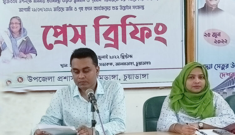 আলমডাঙ্গা ব্যুরো: মুজিববর্ষ উপলক্ষে ভূমিহীন ও গৃহহীন পরিবারকে ৩য় পর্যায়ে(২য় ধাপে)“র জমি ও গৃহ প্রদান কার্যক্রম উদ্বোধন উপলক্ষে প্রেস ব্রিফিং অনুষ্ঠিত। মঙ্গলবার বিকাল ৪টায় উপজেলা পরিষদ হলরুমে প্রেস ব্রিফিং করেন উপজেলা নির্বাহী অফিসার রনি আলম নূর। প্রেস ব্রিফিংয়ের শুরুতে উপজেলা নির্বাহী অফিসার রনিআলম নুর উপস্থিত সকল সাংবাদিককে আন্তরিক শুভেচ্ছা জানিয়ে তিনি লিখিত বক্তব্য পাঠ করেন। লিখিত বক্তব্য তিনি বলেন, হাজার বছরের শ্রেষ্ঠ বাঙালি জাতির পিতা বঙ্গবন্ধু শেখ মুজিবুর রহমানের জন্ম শতবার্ষিকী উপলক্ষে তারই সুযোগ্য কন্যা মাননীয় প্রধানমন্ত্রী শেখ হাসিনার একটি যুগান্তকারী পদক্ষেপ ভূমিহীন ও গৃহীনদের জন্য জমিসহ ঘর প্রদান। মুজিব শতবর্ষ উপলক্ষে ২০২০-২১ ও ২০২১-২২ অর্থবছরে ১ লক্ষ ১৭ ৩২৯ জন ভূমিহীন ও গৃহহীন অর্থাৎ ক শ্রেণী পরিবারকে ২ শতাংশ হারে জমি বন্দোবস্ত প্রদান-পূর্বক দুই কক্ষ বিশিষ্ট সেমি পাঁকা একক গৃহ প্রদান করা হয়। এরই ধারাবাহিকতায় আগামী ২১ জুলাই ২০২২ খ্রিস্টাব্দ তারিখ সকাল ১০ টায় মাননীয় প্রধানমন্ত্রী গণভবন থেকে ভিডিও কনফারেন্সের মাধ্যমে একযোগ সারা বাংলাদেশে দুই শতক জমিসহ ভূমিহীন ও গৃহহীন পরিবারকে ২৬ হাজার ২৩৯টি ২ কক্ষ বিশিষ্ট সেমি পাকা একক গৃহ প্রদান কার্যক্রমের শুভ উদ্বোধন করেন। সারা বাংলাদেশের নায় আলমডাঙ্গা উপজেলায় ৬৩ জন ভূমিহীন ও গৃহীনদের মাঝে দুই শতক জমি ও দুই কক্ষ বিশিষ্ট ঘরের যাবতীয় দলিল সমূহ হস্তান্তর করা হবে। তিনি উল্লেখ্য করে বলেন আলমডাঙ্গা উপজেলায় ইতিপূর্বে প্রথম পর্যায়ে ৫০ জন, দ্বিতীয় পর্যায়ে ৪৫ জন এবং তৃতীয় পর্যায়ে প্রথম ধাপে ১৭ জন উপকার ভোগীদের মাঝে জমিসহ ঘর হস্তান্তর করা হয়েছে।