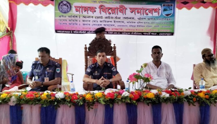 গাংনী প্রতিনিধি: মেহেরপুরের গাংনীতে মাদকবিরোধী সমাবেশ অনুষ্ঠিত হয়েছে। গতকাল সোমবার বিকেলে হোগলবাড়িয়া মোহাম্মদপুর হাজি ভরষ উদ্দিন মাধ্যমিক বিদ্যালয় প্রাঙ্গণে এ সভা অনুষ্ঠিত হয়। গাংনী থানার ভারপ্রাপ্ত কর্মকর্তা ওসি আব্দুর রাজ্জাকের সভাপতিত্বে অনুষ্ঠানে প্রধান অতিথি হিসেবে গুরুত্বপূর্ণ দিক নির্দেশনা দেন মেহেরপুর পুলিশ সুপার মো. রাফিউল আলম। বিশেষ অতিথি ছিলেন মটমুড়া ইউপি চেয়ারম্যান সোহেল আহমেদ। সমাবেশে মাদকের কুফল সম্পর্কে বর্ণনা করেন গাংনী থানার ওসি আব্দুর রাজ্জাক। মাদক ছেড়ে স্বাভাবিক জীবনে ফিরে আসার আহ্বান জানান পুলিশ সুপার রাফিউল আলম। অনুষ্ঠানে স্থানীয় গণ্যমান্য ব্যক্তিবর্গ ছাড়াও বিভিন্ন প্রিন্ট ও ইলেক্ট্রনিক মিডিয়ার সাংবাদিকগণ উপস্থিত ছিলেন।