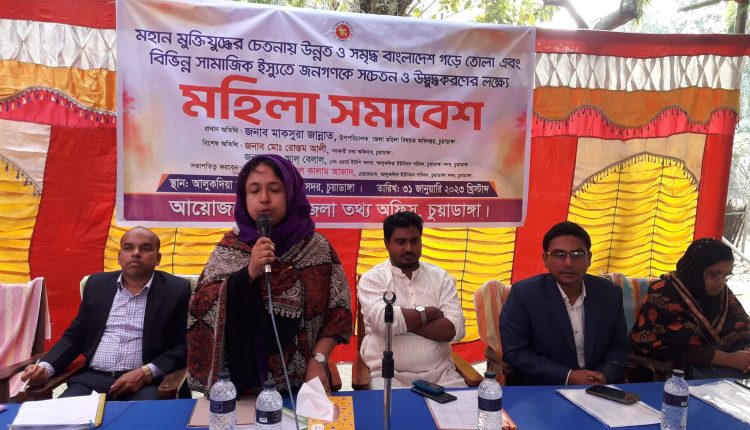 স্টাফ রিপোর্টার: চুয়াডাঙ্গার আলুকদিয়ায় মহিলা সমাবেশ অনুষ্ঠিত হয়েছে। গতকাল মঙ্গলবার বিকেলে জেলা তথ্য অফিসের আয়োজনে আলুকদিয়া চকপাড়ায় এ সমাবেশ অনুষ্ঠিত। সহকারী তথ্য অফিসার রোস্তম আলীর সভাপতিত্বে প্রধান অতিথি ছিলেন চুয়াডাঙ্গা মহিলা বিষয়ক অধিদপ্তরের উপ-পরিচালক মাকসুরা জান্নাত। বক্তব্য রাখেন আলুকদিয়া ১নং ওয়ার্ডের সদস্য আল বেলাল। অনুষ্ঠানে বক্তারা বলেন, মাননীয় প্রধানমন্ত্রী প্রত্যেকটা ক্ষেত্রে নারীদেরকে এগিয়ে নিয়ে যাওয়ার জন্য দেশের উন্নয়নের ধারাবাহিকতায় কাজ করে যাচ্ছেন। আমরা শুধুমাত্র অনুষ্ঠানে গিয়ে শুনলাম, সমাবেশে গেলাম এটুকুই নয় এটাও একটা মূল্যবোধ আছে কিন্তু সেই মূল্যবোধকে কাজে লাগাতে হবে। বার্ষিক কর্মসম্পাদন চুক্তির (এপিএ) আওতায় প্রধানমন্ত্রী ১০টি বিশেষ উদ্যোগে ব্রান্ডিং বিষয়, মুক্তিযুদ্ধের চেতনায় উন্নত রাষ্ট্র ও জাতি গঠনে দেশের অগ্রগতি অর্জন, সাফল্য ও লক্ষ্যসমূহ সমৃদ্ধ বাংলাদেশ গড়ে তোলার অঙ্গীকার বর্তমান সরকারের ভিশন ২০৪১ মহিলা সমাবেশ ও আলোচনা সভা অনুষ্ঠিত হয়। এছাড়াও দেশের অগ্রগতি অর্জন, সাফল্য ও লক্ষ্যসমূহের সাথে জনসমৃদ্ধতা বৃদ্ধির লক্ষ্যে, মানব পাচার, মাদক, সন্ত্রাস, গুজব, জঙ্গিবাদ ও নাশকতা, ইভটিজিং, বাল্যবিবাহ প্রতিরোধ, নৈতিকতা মূল্যবোধ সম্পর্কিত সচেতনতা, তথ্য অধিকার, অটিজম, স্বাস্থ্য ও সামাজিক ইস্যুভিত্তিক বিষয়ে জনগণকে পরামর্শ প্রদান করা হয়। অনুষ্ঠানটির সঞ্চালনায় ছিলেন জেলা তথ্য অফিসের ঘোষক ফারুক হোসেন।