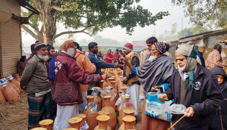 মিরাজুল ইসলাম মিরাজ: দামুড়হুদার জয়রামপুরে শতবর্ষের ঐতিহ্যবাহী খেজুর গুড়ের হাটে বেচাকেনা জমে উঠেছে। ভালো দাম পেয়ে গাছিরাও বেশ খুশি। প্রায় একশ’ বছরের পুরোনো এই হাটটি বসে উপজেলার জয়রামপুর রেলস্টেশনের পাশে। সপ্তাহে দু’দিন শনি ও মঙ্গলবার হাট বসে। প্রতি বছর শীত মরসুমের শুরু থেকে শেষ অবধি খেজুর গুড়ের ব্যাপক কেনাবেচা হয়ে থাকে এখানে। এলাকার গাছিরা ভোর হতেই বিভিন্ন পরিবহন যোগে বিক্রির জন্য হাটে গুড় নিয়ে আসেন। সকাল থেকে শুরু হয় বেচাকেনা। দুপুর ১২টার মধ্যেই গুড় কেনাবেচা শেষ হয়ে যায়। ওজনে, বিনা ওজনে গাছিদের সাথে দরদাম করে কিনে থাকেন ব্যাপারীরা। দূর-দূরান্ত হতে আসা গুড়ের ব্যাপারীরা দরদাম করে নগদ টাকায় গুড় কিনে নিয়ে যান। চলতি মরসুমে গুড়ের দাম ও চাহিদা দুটোই বেশি থাকায় গাছিরা একটু বেশিই খুশি। এ বছর এই হাটে ১০০ থেকে ১২০টাকা কেজি দরে গুড় বিক্রি হচ্ছে। গুড় কেনা শেষ হলে ট্রাক ভর্তি করে ব্যাপারীরা গুড় নিয়ে চলে যান। প্রতি হাটে ৫ থেকে ৬ ট্রাক গুড় এখান থেকে দেশের বিভিন্ন স্থানে চলে যায়। সিরাজগঞ্জ, রাজবাড়ী, পাবনা ও নাটোর ছাড়াও বিভিন্ন এলাকা থেকে ব্যাপারী ও পাইকাররা আসেন গুড় কিনতে।
