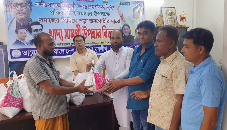 স্টাফ রিপোর্টার: চুয়াডাঙ্গায় পবিত্র রমজান মাস উপলক্ষ্যে জেলা যুবলীগের উদ্যোগে সমাজের পিছিয়ে পড়া মানুষের মাঝে খাদ্য সামগ্রী বিতরণ করা হয়েছে। রমজানের শুরু থেকেই যুবলীগের কেন্দ্রীয় কর্মসূচির অংশ হিসেবে সারাদেশে এ কার্যক্রম পরিচালনা করছে যুবলীগ। এর অংশ হিসেবে গতকাল শনিবার বিকেল ৪টায় জেলা যুবলীগের আহ্বায়ক ও জেলা ক্রীড়া সংস্থার সাধারণ সম্পাদক নঈম হাসান জোয়ার্দ্দারের নেতৃত্বে যুবলীগের কার্যালয়ে খাদ্য সামগ্রী বিতরণ করা হয়। এ সময় তিনি বলেন, ‘মাননীয় প্রধানমন্ত্রী জননেত্রী দেশরত্ন শেখ হাসিনা দেশের এই সঙ্কটকালে গরিব অসহায়দের পাশে দাড়ানোর আহ্বান জানিয়েছেন। তাই দেশব্যাপী যুবলীগের উদ্যোগে পবিত্র রমজান মাসে খাদ্য সামগ্রী বিতরণ করা হচ্ছে। প্রত্যেকে নিজ নিজ এলাকায় যদি এভাবে মানুষের পাশে দাঁড়ায় তাহলে কোনো মানুষ ক্ষুধার্ত থাকবে না। চুয়াডাঙ্গা যুবলীগ আগেও মানুষের পাশে ছিলো এখনও আছে ভবিষ্যতেও থাকবে।’ এ সময় উপস্থিত ছিলেন জেলা যুবলীগের সদস্য সাজেদুল ইসলাম লাভলু, আজাদ আলী, হাফিজুর রহমান হাপু, আবু বক্কর সিদ্দিক আরিফ। যুবলীগ নেতা কলেজ ছাত্রলীগের সাবেক সভাপতি আল ইমরান শুভ, পদ্মবিলা ইউনিয়ন যুবলীগের সহ সভাপতি বিপ্লব হোসেন, বিপুল জোয়ার্দ্দার, ছাত্রলীগের সাবেক নেতা রামীম হোসেন সৈকত, পৌর ছাত্রলীগের সাবেক সহ সভাপতি সামিউল শেখ সুইট, দিপু বিশ্বাস, ছরো, জেলা ছাত্রলীগের সাবেক গ্রন্থনা ও প্রকাশনা উপ-সম্পাদক শেখ আনোয়ার, সাবেক সদস্য ইমরান ফেরদৌস, জাহাঙ্গীর আলম টিলু প্রমুখ।