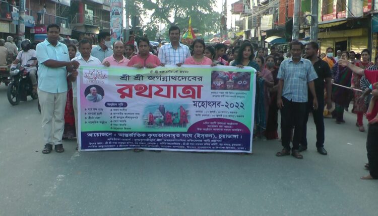 স্টাফ রিপোর্টার: উৎসাহ-উদ্দীপনার মধ্যদিয়ে পালন করা হচ্ছে সনাতন ধর্মাবলম্বীদের অন্যতম প্রধান ধর্মীয় অনুষ্ঠান রথযাত্রা উৎসব। রথযাত্রাকে কেন্দ্র করে নেয়া হয় কঠোর নিরাপত্তা ব্যবস্থা। করোনাভাইরাস মহামারির কারনে দুই বছর পর চুয়াডাঙ্গা ও মেহেরপুরসহ সারাদেশে সনাতন ধর্মাবলম্বীদের শ্রী শ্রী জগন্নাথদেবের রথযাত্রা অনুষ্ঠিত হয়েছে। চুয়াডাঙ্গায় রথযাত্রা মহোৎসব উপলক্ষে এক বর্ণাঢ্য র‌্যালি শহর প্রদক্ষিণ করে। আজ শুক্রবার বিকেল সাড়ে ৫টায় চুয়াডাঙ্গা শহরের শহীদ হাসান চত্বর থেকে শুরু হয় রথযাত্রা। শহর প্রদক্ষিণ শেষে রথযাত্রা শেষ হবে ফেরিঘাট রোডের শ্রী শ্রী সত্য নারায়ণ মন্দিরে। আগামি ৮ জুলাই অনুষ্ঠিত হবে উল্টো রথযাত্রা। রথযাত্রা উৎসব উপলক্ষে ৮ দিন ব্যাপি থাকবে নানা আনুষ্ঠানিকতা। এর মধ্যে রয়েছে কীর্তন মেলা, ভজন সঙ্গীত অনুষ্ঠান, আলোচনা সভা, ভোগ আরতি, লীলামৃত পাঠ, সন্ধ্যা আরতি ও মহাপ্রসাদ বিতরণ।  আলমডাঙ্গা ব্যুরো জানিয়েছে আলমডাঙ্গায় শ্রী শ্রী জগন্নাথ দেবের রথযাত্রা উদযাপিত হয়েছে। গতকাল শুক্রবার বিকেল ৪টার দিকে রথযাত্রা উদযাপন কমিটির সভাপতি সুশীল কুমার ভৌতিকার নেতৃত্বে বর্ণাঢ্য শোভাযাত্রা শহরের প্রধান সড়ক প্রদক্ষিণ শেষে পুরাতন বাজার সার্বজনীন দূর্গা মন্দিরে গিয়ে শোভাযাত্রা শেষ হয়। রথযাত্রা উপলক্ষে সনাতন ধর্মাবলম্বীরা রথী হিসেবে সানন্দে অংশগ্রহণ করেন। তাছাড়া রথযাত্রা উপলক্ষে পুরাতন বাজার সার্বজনীন দুর্গামন্দির প্রাঙ্গণে মেলা জমে ওঠে। মুখরিত হয়ে ওঠে রথের মেলাস্থল। অন্যান্যের মধ্যে রথযাত্রায় অংশ নেন শ্রী শ্রী জগন্নাথ দেবের রথযাত্রা কমিটির সভাপতি সুশীল কুমার ভৌতিকা চুয়াডাঙ্গা জেলা পূজা উদযাপন কমিটির সহ-সভাপতি প্রশান্ত অধিকারী, উপজেলা পূজা উদযাপন কমিটির সভাপতি ডাক্তার অমল কুমার বিশ্বাস, পৌর পূজা উদযাপন কমিটির সভাপতি পরিমল কুমার ঘোষ, সাধারণ সম্পাদক ও জেলা পূজা উদযাপন কমিটির সাংগঠনিক সম্পাদক ও আলমডাঙ্গা পৌর ছাত্রলীগের সভাপতি নয়ন সরকার, পলাশ আচার্য, বিদ্যুৎ কুমার সাহা, পবন ভৌতিকা, উৎপল দত্ত, বরুণ পান্ডে, রাজকুমার অধিকারী, প্রশান্ত কুমার শিহি, সুব্রত সাহা, গণেশ অধিকারী প্রমুখ।