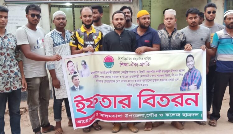 চুয়াডাঙ্গার আলমডাঙ্গায় বিএনপি চেয়ারপারসন খালেদা জিয়া ও ভারপ্রাপ্ত চেয়ারম্যান তারেক রহমানের সুস্থতা কামনায় দোয়া ও ইফতার বিতরণ অনুষ্ঠিত হয়েছে। জাতীয়তাবাদী ছাত্রদলের সভাপতি কাজী রওনকুল ইসলাম শ্রাবণের পক্ষ থেকে এ কর্মসূচি পালন করে আলমডাঙ্গা উপজেলা, পৌর ও কলেজ শাখা ছাত্রদলের নেতৃবৃন্দ। এসময় পবিত্র মাহে রমজান উপলক্ষে দেড় শতাধিক গরীব ও দুস্থদের ভিতর ইফতারি বিতরণ করা হয়।