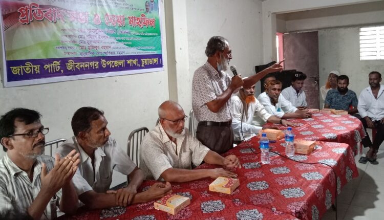 জীবননগর ব্যুরো: জাতীয় পার্টির চেয়ারম্যান ও বিরোধী দলীয় উপনেতা গোলাম মোহাম্মদ কাদেরের গাড়ীতে ধাক্কা দিয়ে আহত করার প্রতিবাদে ও তার সুস্থ্যতা কামনা করে জীবননগর উপজেলা জাতীয় পার্টি দোয়া অনুষ্ঠানের আয়োজন করে। গতকাল বৃহস্পতিবার বিকেলে শহরের হোটেল থ্রি-স্টারের সভাকক্ষে এক প্রতিবাদসভা ও দোয়া অনুষ্ঠান অনুষ্ঠিত হয়। জীবননগর উপজেলা জাতীয় পার্টির সভাপতি অবসরপ্রাপ্ত লেফটেন্যান্ট (অনারারী) মুজিবুর রহমানের সভাপতিত্বে অনুষ্ঠিত প্রতিবাদ সভা ও দোয়া অনুষ্ঠানে প্রধান অতিথির বক্তব্য রাখেন চুয়াডাঙ্গা জেলা জাতীয় পার্টির যুগ্ম-আহ্বায়ক শাহাবুদ্দিন বিশ্বাস খোকন। অনুষ্ঠানে বিশেষ অতিথি হিসাবে বক্তব্য রাখেন দামুড়হুদা উপজেলা জাতীয় পার্টির সভাপতি শহিদুল ইসলাম ও দর্শনা থানা শাখার সভাপতি নুরুজ্জামান। এ ছাড়াও বক্তব্য রাখেন জীবননগর উপজেলা জাতীয় পার্টির সহ-সভাপতি মমিনুল ইসলাম হানেহার, সাধারণ সম্পাদক মোসাব কাক্কা, জীবননগর পৌর জাতীয় পার্টির সাধারণ সম্পাদক আতিয়ার রহমান, জেলা জাতীয় পার্টির সদস্য শহিদুল ইসলাম, হাসাদহ ইউনিয়ন জাতীয় পার্টির সভাপতি মতিয়ার রহমান, সাধারণ সম্পাদক আব্দুল হান্নান, সীমান্ত ইউনিয়ন জাতীয় পার্টির সভাপতি ওমেদুল ইসলাম, বাঁকা ইউনিয়ন জাতীয় পার্টির সভাপতি তরিকুল ইসলাম, সাধারণ সম্পাদক রহিম শিকদার ও ইমরান হোসেন। অনুষ্ঠিত প্রতিবাদসভায় বক্তারা বলেন, জাতীয় পার্টির চেয়ারম্যান জনবন্ধু গোলাম মোহাম্মদ কাদেরকে হত্যা করার উদ্দেশ্যে তার গাড়ীতে পূর্বপরিকল্পিত ভাবে পিঁছন দিক থেকে ধাক্কা দিয়ে আহত করা হয়েছে। আল্লাহ জিএম কাদেরকে দেশবাসীর সেবায় বাঁচিয়ে রেখেছেন। প্রতিবাদ সভা শেষে বিরোধী দলীয় উপনেতা গোলাম মোহাম্মদ কাদেরের সুস্থ্যতা কামনা করে দোয়া পরিচালনা করেন মাও. জাহিদুল ইসলাম। প্রতিবাদ সমাবেশে জাতীয় পার্টি ও তার অঙ্গ সংগঠনের নেতাকর্মিরা উপস্থিত ছিলেন।