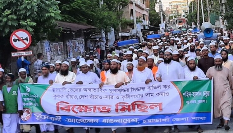 স্টাফ রিপোর্টার: জ্বালানি তেলের অস্বাভাবিক মূল্যবৃদ্ধির প্রতিবাদে এবং সার ও কৃষি পণ্যের মূল্য কমানোর দাবিতে বিক্ষোভ সমাবেশ করেছেন ইসলামী আন্দোলন বাংলাদেশ। গত মঙ্গলবার বিকেলে কেন্দ্রীয় কর্মসূচির অংশ হিসেবে চুয়াডাঙ্গা, মেহেরপুর ও ঝিনাইদহে এ কর্মসূচির আয়োজন করা হয়। সমাবেশে বক্তরা বলেন, ঐক্যবদ্ধ গণআন্দোলনের মাধ্যমে ভোটারবিহীন সরকারের পতন ঘটিয়ে জনগণের সরকার প্রতিষ্ঠা করতে হবে। জনগণের সরকার নয় বলে জনগণের প্রতি তাদের কোন দায়বদ্ধতা নেই। এজন্য স্বেচ্ছাচারি কায়দায় মধ্যরাতে দেশের ইতিহাসে জ্বালানি তেলের সর্বোচ্চ মূল্যবৃদ্ধি করে দেশকে দুর্ভিক্ষের দিকে ঠেলে দিয়েছে। বক্তারা আরও বলেন, আন্তর্জাতিক বাজারের সাথে সমন্বয়ের কথা বললেও আন্তর্জাতিক বাজারে তেলের দাম কমতে শুরু করেছে। তাহলে ৫০% দাম বৃৃদ্ধির সিদ্ধান্ত কার স্বার্থে? বিপিসি টানা ৭ বছরে ৪৩ হাজার কোটি টাকা মুনাফা করেছে। এ ৪৩ হাজার কোটি টাকা কোথায়? এর হিসেব জনগণের কাছে দিতে হবে। চুয়াডাঙ্গায় গত মঙ্গলার বিকেলে শহীদ হাসান চত্ব¡রে ইসলামী আন্দোলন বাংলাদেশের আয়োজনে মিছিলটি শহরের প্রধান প্রধান সড়ক প্রদক্ষিণ শেষে পুনরায় শহিদ হাসান চত্বরে মিলিত হয়ে সংক্ষিপ্ত মোনাজাতের মাধ্যমে শেষ হয়। দোয়া ও মোনাজাত পরিচালনা করেন ইসলামী আন্দেলন জেলা মুক্তিযোদ্ধা বিষয়ক সম্পাদক মুফতি আব্দুস সালাম। অন্যান্যদের মধ্যে বক্তব্য রাখেন ইসলামী আন্দোলন বাংলাদেশ জেলা সেক্রেটারি মো. তুষার ইমরান সরকার, জেলা সদস্য মাওলানা জহুরুল ইসলাম, জীবননগর থানা সভাপতি মাওলানা আব্দুল ওয়াদুদ, আলমডাঙ্গা থানা সভাপতি মাওলানা আকরাম হুসাইন সাইরাফি, জাতীয় ওলামা মাশায়েখ ও আইম্মা পরিষদ সভাপতি মাওলানা মোহাম্মদ আলী, ইসলামী শ্রমিক আন্দোলনের সভাপতি শেখ পিয়ার মোহাম্মদ, ইসলামী যুব আন্দোলনের সভাপতি মুফতি আব্দুল্লাহ আল মামুন, ইসলামী ছাত্র আন্দোলনের জেলা সভাপতি আবু বকর। অনুষ্ঠান সঞ্চালনা করেন ইসলামী আন্দোলন জেলা প্রচার সম্পাদক আশিকুল আলম সজিব ও ইসলামী শ্রমিক আন্দোলন জেলা সেক্রেটারি মাওলানা সাইফুল ইসালাম। মেহেরপুর অফিস জানিয়েছে, মেহেরপুরে বিক্ষোভ সমাবেশ করেছেন ইসলামী আন্দোলন বাংলাদেশ মঙ্গলবার বিকেলে এ বিক্ষোভ মিছিল অনুষ্ঠিত হয়। ইসলামী আন্দোলন বাংলাদেশ কেন্দ্রীয় কমিটির সরকারি মহাসচিব মাওলানা আব্দুল কাদেরের নেতৃত্বে বিক্ষোভ মিছিলটি মেহেরপুর শহরের হোটেল বাজার থেকে শুরু করে প্রধান প্রধান সড়ক প্রদক্ষিণ শেষে পৌরসভার সামনে শেষ হয়। পরে সেখানে পথসভা অনুষ্ঠিত হয়। ইসলামী আন্দোলন বাংলাদেশ মেহেরপুর জেলা শাখার সভাপতি খাদেমুল ইসলামের সভাপতিত্বে পথসভায় প্রধান অতিথি হিসেবে বক্তব্য রাখেন ইসলামী আন্দোলন বাংলাদেশ
