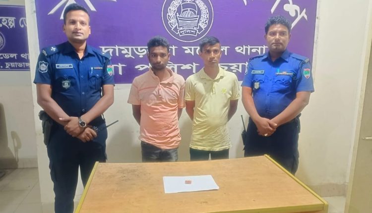 কার্পাসডাঙ্গা প্রতিনিধি: দামুড়হুদা উপজেলার হুদাপাড়া গ্রামের আজিজুল হক গিরি (২৫) ও জাহাজপোতা গ্রামের সোহেল রানা (২২) ইয়াবাসহ আটক হয়েছে। গতকাল বুধবার রাত ৮টায় কার্পাসডাঙ্গা ফাঁড়ি পুলিশের ইনচার্জ এসআই ইমরান হোসেন ও এএসআই মসলেম উদ্দিনের নেতৃত্বে মাদকবিরোধী অভিযান চালায় কোমরপুর গ্রামের রাস্তার ওপর। এ সময় হুদাপাড়া গ্রামের মনিরুল ইসলামের ছেলে আজিজুল হক গিরি ও একই ইউনিয়নের জাহাজপোতা গ্রামের রশিদ আলীর ছেলে সোহেল রানার কাছে থাকা ৫১ পিস ইয়াবাসহ তাদের আটক করে পুলিশ সদস্যরা। আসামিদের বিরুদ্ধে মাদকদ্রব্য নিয়ন্ত্রণ আইনে মামলার প্রস্তুতি চলছে বলে জানিয়েছে পুলিশ।