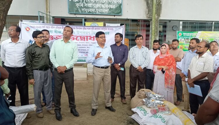 দামুড়হুদা অফিস: চুয়াডাঙ্গার দামুড়হুদায় বিনামূল্যে বীজ, সার ও উপকরণ বিতরণের উদ্বোধন করা হয়েছে। বুধবার বেলা ১১টার দিকে উপজেলা কৃষি অফিস চত্বরে ২০২২-২০২৩ অর্থ বছরের খরিপ মরসুমের গ্রীস্মকালীন প্রনোদনার পেঁয়াজ বীজ, সার ও উপকরণ বিতরণের উদ্বোধন করা হয়। দামুড়হুদা উপজেলা কৃষি সম্প্রসারণ অধিদপ্তরের আয়োজনে চুয়াডাঙ্গা জেলা কৃষি অফিসের উপ-পরিচালক বিভাস চন্দ্র শাহা প্রধান অতিথি হিসাবে উপস্থিত থেকে এর উদ্বোধন করেন। প্রধান অতিথি বলেন, কৃষি প্রনোদনা যারা ব্যবহার না করেন তা হলে স্মাটকার্ড পাবেন না। আমাদের কাছে তালিকা আছে আমরা সরেজমিনে মাঠে যাবো। কোনো চাষি যদি বীজ, সার ও টাকা নিয়ে চাষ না করেন তাদের বিরুদ্ধে ব্যবস্থা নেয়া হবে। কৃষি অফিস সূত্রে জানা গেছে, চলতি খরিপ মরসুমে পেঁয়াজ উৎপাদন বৃদ্ধির লক্ষে কৃষি প্রণোদনা কর্মসূচির আওতায় ৩৫০জন কৃষকের মাঝে ১কেজি পেঁয়াজের বীজ, ২০কেজি ডিএপি, ২০কেজি এমওপি সার, বালাই নাষক ১প্যাকেট, পলেথিন ও সুতা ও নগদ ২হাজার ৮০০টাকা দেওয়া হবে। এই বীজ, সার বিতরণের উদ্বোধনি অনুষ্ঠানে উপস্থিত ছিলেন, দামুড়হুদা উপজেলা কৃষি অফিসার কৃষিবিদ মনিরুজ্জামান, উপজেলা পরিষদের মহিলা ভাইস চেয়ারম্যান শাহিদা খাতুন, উপজেলা কৃষি সম্প্রসারণ অফিসার অভিজিত কুমার বিশ্বাস, উপ-সহকারী কৃষি অফিসার জালাল উদ্দীন, সাইফুল ইসলাম, সারকেটিং ফেসিলেটিটর বদরুল আলমসহ কৃষি অফিসের সকল কর্মকর্তা কর্মচারী ও কৃষকবৃন্দু।
