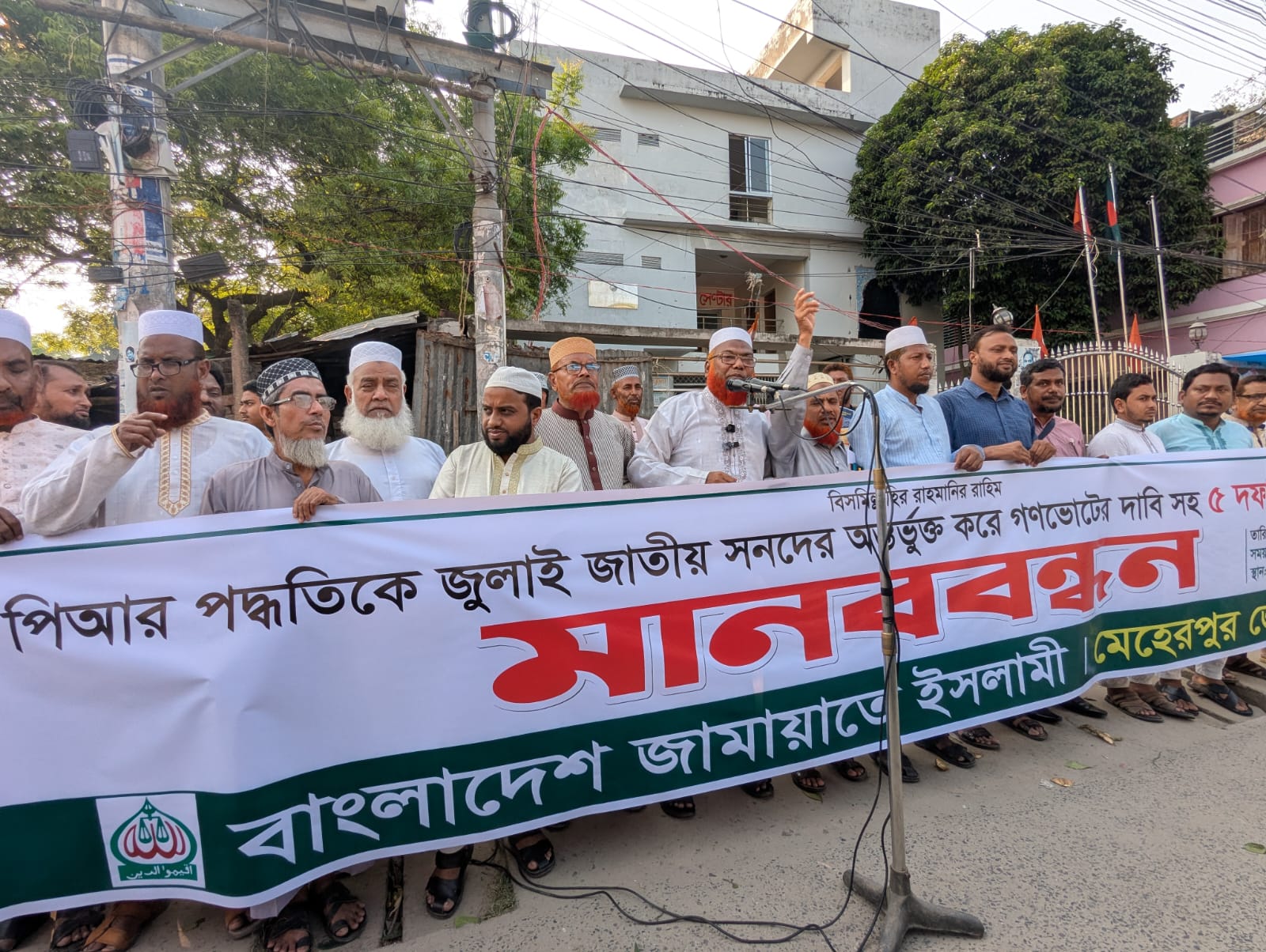 মেহেরপুর অফিস:পি.আর পদ্ধতিকে জুলাই জাতীয় সনদের অন্তর্ভুক্ত করে গণভোটের দাবিতে মেহেরপুরে মানববন্ধন করেছে বাংলাদেশ জামায়াতে ইসলামী মেহেরপুর জেলা শাখা।