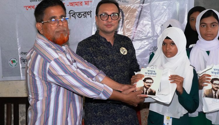 স্কুলে স্কুলে বঙ্গবন্ধুকে জানতে অসমাপ্ত আত্মজীবনী বিতরণকালে দিলীপ কুমার