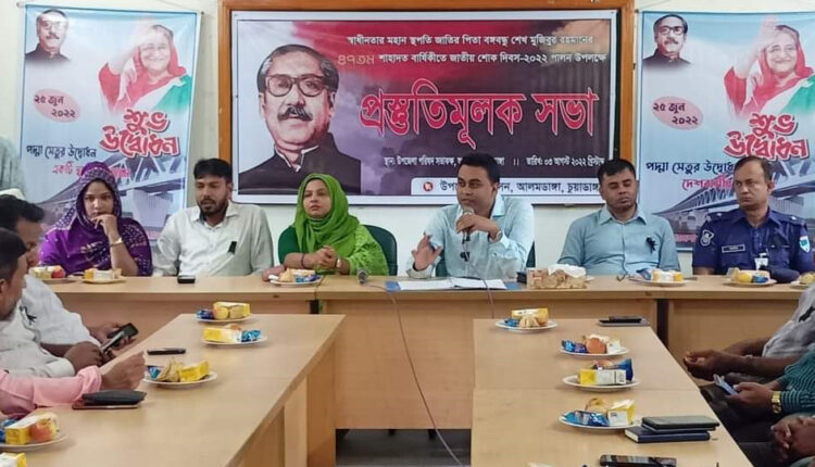 আলমডাঙ্গা ব্যুরো: আলমডাঙ্গা উপজেলা প্রশাসনের উদ্যোগে স্বাধীনতার মহান স্থপতি জাতির পিতা বঙ্গবন্ধু শেখ মুজিবুর রহমানের ৪৭তম শাহাদাত বার্ষিকীতে জাতীয় শোক দিবস যথাযথ মর্যাদায় পালন উপলক্ষে প্রস্তুতিমূলকসভা অনুষ্ঠিত হয়েছে। গতকাল ৩ আগস্ট সকাল দশটার দিকে উপজেলা পরিষদ মিলনায়তনে প্রস্তুতিসভা অনুষ্ঠিত হয়। সভায় উপজেলা নির্বাহী অফিসার রনি আলম নূরের সভাপতিত্বে প্রধান অতিথি ছিলেন উপজেলা পরিষদের চেয়ারম্যান আইয়ুব হোসেন। বিশেষ অতিথি ছিলেন উপজেলা পরিষদের ভাইস চেয়ারম্যান অ্যাডভোকেট খন্দকার সালমুন আহমেদ ডন, মহিলা ভাইস চেয়ারম্যান কাজী মারজাহান নিতু, সহকারী কমিশনার (ভূমি) রেজওয়ানা নাহিদ, উপজেলা স্বাস্থ্য ও প.প. কর্মকর্তা ডা. হাদী জিয়াউদ্দিন আহমেদ, প.প কর্মকর্তা হাসানুজ্জামান খান, মৎস্য কর্মকর্তা ফাতেমা কামরুন নাহার আঁখি, পুলিশ পরিদর্শক তদন্ত আব্দুল আলিম, পৌর প্যানেল মেয়র খন্দকার মজিবুল হক। আলোচনা সভায় কলেজিয়েট স্কুলের উপাধ্যক্ষ শামীম রেজার উপস্থাপনায় অন্যান্যের মধ্যে বক্তব্য রাখেন বীর মুক্তিযোদ্ধা অগ্নিসেনা মইনুদ্দিন, বীর মুক্তিযোদ্ধা শেখ নূর মোহাম্মদ জকু, বণিক সমিতির সভাপতি আরেফিন মিয়া মিলন, সাধারণ সম্পাদক কামাল হোসেন, কোষাধ্যক্ষ সম্পাদক আলাউদ্দিন, উপজেলা প্রকৌশলী আব্দুর রশিদ, উপজেলা মাধ্যমিক শিক্ষা অফিসার আব্দুল বারী, উপজেলা শিক্ষা অফিসার শামসুজ্জোহা, ইউআরসি ইন্সটেক্টর জামাল হোসেন, মহিলা বিষয়ক অফিসার মাখসুরা জান্নাত, বিআরডিবি কর্মকর্তা শায়লা শারমিন, জনস্বাস্থ্য সহকারী প্রকৌশলী হাসিবুজ্জামান, প্রধান শিক্ষক রবিউল ইসলাম খান প্রমুখ।