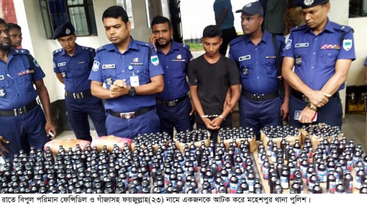 মহেশপুর প্রতিনিধি: ঝিনাইদহের মহেশপুরে মাদকবিরোধী অভিযান পরিচালনা করে ৪৫০ বোতল ফেনসিডিল ও ২ কেজি গাঁজাসহ ফয়জুল্লাহ (২৩) নামের এক যুবককে আটক করেছে মহেশপুর থানা পুলিশ। বুধবার রাত ৩টার সময় তাকে আটক করা হয়। আটককৃত ফয়জুল্লাহ উপজেলার বেতবাড়িয়া গ্রামের লুৎফর রহমানের ছেলে। পুলিশ জানায়, অতিরিক্ত পুলিশ সুপার কোটচাঁদপুর সার্কেল মোহাইমিনুল ইসলামের নির্দেশে মহেশপুর থানার ওসি সেলিম মিয়ার নেতৃত্বে এসআই আব্দুল জলিল সঙ্গীয় ফোর্স নিয়ে অভিযান চালিয়ে উপজেলার সীমান্তবর্তী বড়বাড়ি গ্রামের মাঠের ভিতর একটি মেহগুনি বাগানের মধ্য থেকে ফয়জুল্লাহ(২৩) কে ৪৫০ বোতল ফেনসিডিল ও ২ কেজি গাঁজাসহ আটক করে। এ বিষয়ে সকাল ১১টায় মহেশপুর থানায় প্রেস ব্রিফিংয়ে অতিরিক্ত পুলিশ সুপার মোহাইমিনুল ইসলাম বলেন, এই চালান ধরার জন্য তারা কয়েকদিন ধরে সোর্সের মাধ্যমে চেষ্টা করছিল অবশেষে তারা কৃতকার্য হয়। এ সময় পুলিশের উপস্থিতি টের পেয়ে ৪/৫ জন পালিয়ে যায় এবং একজন আটক হয়। এ ব্যাপারে মহেশপুর থানায় মাদক আইনে মামলা হয়েছে।