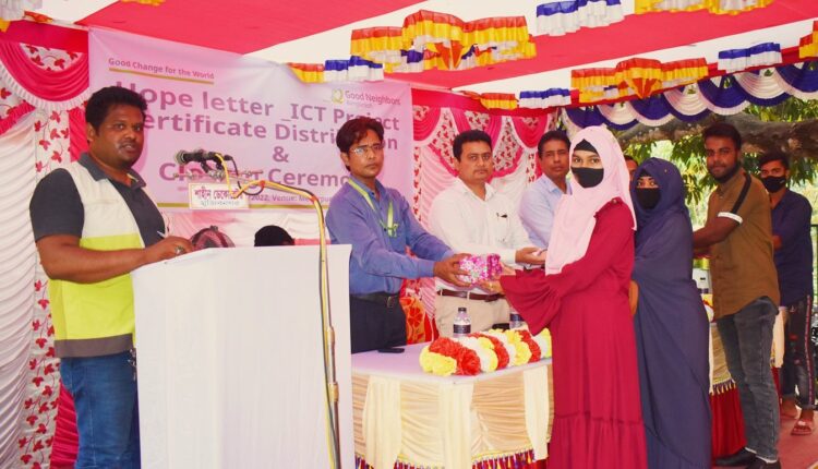 মুজিবনগর প্রতিনিধি: মেহেরপুরের মুজিবনগরে গুডনেইবারর্স মেহেরপুর সিডিপি’র উদ্যোগে গুডনেইবারর্স’র বাংলাদেশ আইসিটি এডুকেশন প্রজেক্টের মাধ্যমে যুবক যুবতীদের কম্পিউটার প্রশিক্ষণ শেষে যুব উন্নয়ন অধিদপ্তর কর্তৃক সরকারী সাটিফিকেট বিতরণ করা হয়েছে।