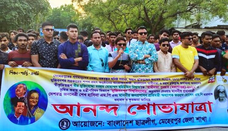 গতকাল বুধবার বিকেলে মেহেরপুর জেলা প্রশাসকের কার্যালয়ের সামনে থেকে আনন্দ শোভাযাত্রা বের করা হয়। জেলা ছাত্রলীগের সভাপতি আব্দুস সালাম বাঁধনের নেতৃত্বে শোভাযাত্রাটি মেহেরপুর শহরের প্রধান প্রধান সড়ক প্রদক্ষিণ শেষে মেহেরপুর বড়বাজার এলাকায় গিয়ে শেষ হয়। পরে সেখানে এক সমাবেশ অনুষ্ঠিত হয়। জেলা ছাত্রলীগের সভাপতি আব্দুস সালাম বাঁধনের সভাপতিত্বে সভায় বক্তব্য রাখেন জেলা ছাত্রলীগের সহ-সভাপতি দুলাল মাহমুদ, সরকারি কলেজ শাখা ছাত্রলীগের সাধারণ সম্পাদক কুতুবউদ্দিন, সদর উপজেলা ছাত্রলীগের সভাপতি খন্দকার জুলকারনাইন বায়োজিদ প্রমুখ।