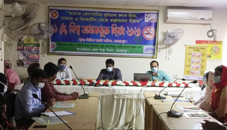 মেহেরপুর অফিস: “তামাক কোম্পানির কুটচাল রুখে দাও, তামাক ও নিকোটিন থেকে তরুণদের বাঁচাও” এ প্রতিপাদ্যে বিশ্ব তামাকমুক্ত দিবস পালন করেছে মেহেরপুর জেলা ও উপজেলা তামাক নিয়ন্ত্রণ টাস্কফোর্স কমিটি। এ দিবস পালন উপলক্ষে গতকাল রোববার দুপুরে মেহেরপুর সিভিল সার্জন সম্মেলনকক্ষে স্বাস্থ্য বিধি মেনে আলোচনাসভা অনুষ্ঠিত হয়। একই আলোকে গাংনী ও মুজিবনগর উপজেলা নির্বাহী অফিসার সভাকক্ষে পৃথক আলোচনা সভার আয়োজন করে টাস্কফোর্স কমিটি।