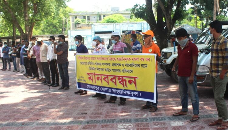 মেহেরপুর প্রতিনিধি: মেহেরপুর-২ আসনের সাবেক স্বতন্ত্র সংসদ সদস্য মকবুল হোসেন বিরুদ্ধে “পরের বাড়ি দখলে রাখার” সংবাদ প্রকাশ করায় মেহেরপুর প্রতিদিনের সম্পাদক ইয়াদুল মোমিন, প্রকাশক এমএএস ইমন ও যুগ্ম সম্পাদক আল আমীনের বিরুদ্ধে ডিজিটাল নিরাপত্তা আইনে মামলা দায়েরের প্রতিবাদে মানববন্ধন করেছেন মেহেরপুরের সাংবাদিকরা। গতকাল সোমবার সকাল সাড়ে ১০টার দিকে মেহেরপুর জেলা প্রশাসকের কার্যালয় চত্বরে সামাজিক দূরত্ব বজায় রেখে সাংবাদিকরা এ কর্মসূচি পালন করেন। সিনিয়র সাংবাদিক তোজাম্মেল আযমের নেতৃত্বে মানববন্ধনে বক্তব্য দেন সাংবাদিক রফিকুল আলম, মুজাহিদ মুন্না, হারুনুর রশিদ রবি, ডিএম মুকিদ ও মিজানুর রহমান।