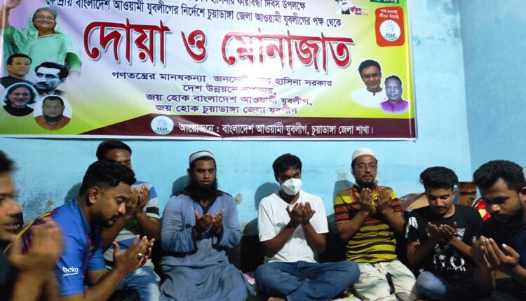 চুয়াডাঙ্গায় জেলা যুবলীগের পক্ষ থেকে গতকাল বৃহস্পতিবার রাত সাড়ে ৯টায় জেলা যুবলীগের কার্যালয়ে এ অনুষ্ঠানের আয়োজন করা হয়। দোয়া অনুষ্ঠানে প্রধান অতিথি ছিলেন বাংলাদশে যুবলীগ চুয়াডাঙ্গা জেলা শাখার আহ্বায়ক নঈম হাসান জোয়ার্দ্দার। অনুষ্ঠানে দোয়া পরিচালনা করেন শাহিনুর রশিদ। উপস্থিত ছিলেন যুবলীগ নেতা পিরু, মাসুদুর রহমান মাসুম, বিপ্লব হোসেন, রামিম হাসান শৈকত, রাসেল, বিপুল, সাকিব, ইমরান প্রমুখ।