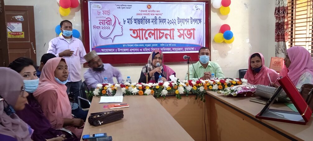 দামুড়হুদা অফিস জানিয়েছে, দামুড়হুদায় উপজেলা প্রশাসন ও মহিলা বিষয়ক অধিদফতরের আয়োজনে উপজেলা পরিষদ চত্বর থেকে র্যালি বের করা হয়। র্যালিটি উপজেলার বিভিন্ন সড়ক প্রদক্ষিণ শেষে উপজেলা পরিষদ চত্বরে এসে শেষ হয়। পরে উপজেলা পরিষদ সভাকক্ষে আলোচনাসভা অনুষ্ঠিত হয়। আলোচনা সভায় সভাপতিত্ব করেন উপজেলা নির্বাহী অফিসার তাছলিমা আক্তার। এসময় উপস্থিত ছিলেন উপজেলা কৃষি অফিসার মনিরুজ্জামান, উপজেলা পরিষদের ভাইস চেয়ারম্যান সহিদুল ইসলাম, মহিলা ভাইস চেয়ারম্যান শাহিদা খাতুন, দামুড়হুদা সদর ইউপি চেয়ারম্যান উপজেলা যুবলীগের সাধারণ সম্পাদক হযরত আলী, প্রাণিসম্পদ কর্মকর্তা আব্দুল্লা আল মামুন, প্রকল্প বাস্তবায়ন কর্মকর্তা আশরাফুল আলম, সহকারী প্রগ্রামান ব্যনবেজ আব্দুল কাদির, মৎস্য সম্প্রসারণ কর্মকর্তা ফারুক হোসেন প্রমুখ। অনুষ্ঠানে স্বাগত বক্তব্য রাখেন উপজেলা মহিলা বিষয়ক কর্মকর্তা হুসনে জাহান। অনুষ্ঠান শেষে দুজন মহিলা উদ্যোক্তা ওয়ারিশ বিশ্বাস ঝরনা ও সুমাইয়া খাতুনকে ভালো কাজের জন্য সম্মাননা স্মারক প্রদান করা হয়।