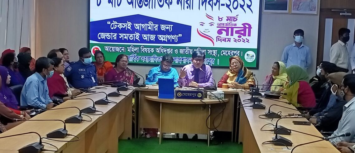 মেহেরপর অফিস জানিয়েছে, মেহেরপুরে আন্তর্জাতিক নারী দিবস ২০২২ পালন করা হয়েছে। দিবসটি উপলক্ষে মঙ্গলবার সকালে মেহেরপুর জেলা প্রশাসকের সম্মেলনকক্ষে আলোচনাসভা অনুষ্ঠিত হয়। মেহেরপুরে জেলা প্রশাসক ড. মোহাম্মদ মুনসুর আলম খানের সভাপতিত্বে বক্তব্য রাখেন মেহেরপুর মহিলা বিষয়ক অধিদফতরের সভাপতি শামীম আরা হীরা, মেহেরপুর সদর উপজেলা পরিষদ মহিলা ভাইস চেয়ারম্যান লতিফুন্নেছা লতা, মহিলা বিষয়ক অধিদফতরের উপ-পরিচালক নিলা হাফিয়া, মেহেরপুর জেলা বঙ্গবন্ধু শিক্ষা ও গবেষণা পরিষদের সভাপতি প্রফেসর হাসানুজ্জামান মালেক প্রমুখ। মেহেরপুর জেলা মহিলা বিষয়ক অধিদফতর ও জাতীয় মহিলা সংস্থার আয়োজিত আলোচনাসভায় শহর যুব মহিলা লীগের সভানেত্রী রোকসানা কামাল রুনু, অতিরিক্ত পুলিশ সুপার (সদর সার্কেল) অপু সরোয়ার, সিডিপি উপ-পরিচালক প্রভঞ্জন বিশ্বাস, নূর জান্নাতুল আরা প্রমুখ উপস্থিত ছিলেন।