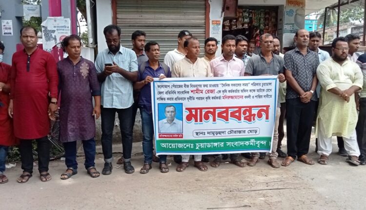 দর্শনা/দামুড়হুদা অফিস: দামুড়হুদা উপজেলা কৃষি অফিসে তথ্য চাইতে গিয়ে দৈনিক সকালের সময় পত্রিকার জেলা প্রতিনিধি শামীম রেজাকে উপজেলা কৃষি কর্মকর্তা মনিরুজ্জামান লাঞ্ছিত করার প্রতিবাদে মানববন্ধন করেছে চুয়াডাঙ্গার বিভিন্ন ইউনিটের সাংবাদিকরা। গতকাল মঙ্গলবার সকাল সাড়ে ১০টার দিকে দামুড়হুদা উপজেলার পরিষদের গেটের সামনে এই কর্মসূচি পালন করেন জেলায় কর্মরত সকল ইলেকট্রনিক ও প্রিন্ট মিডিয়ার সাংবাদিকরা। মানববন্ধনে বক্তব্য রাখেন দামুড়হুদা প্রেসক্লাবের সভাপতি এম নুরুন্নবীর সভাপতিত্বে মানববন্ধনে বক্তব্য রাখেন দর্শনা প্রেসক্লাবের সভাপতি আওয়াল হোসেন, সাধারণ সম্পাদক এসএম উসমান, সাবেক সভাপতি মনিরুজ্জামান ধীরু, সাংবাদিক খাইরুল ইসলাম, হুসাইন মালিক, আব্দুস সামাদ, মেহেদী হাসান মিলন, হাসমত আলী, এম এ জলিল, তানজির ফয়সাল, মুকুল প্রমুখ। মানববন্ধনে সাংবাদিক নেতারা আগামী এক সপ্তাহ’র মধ্যে দূর্ণীতি পরায়ন দামুড়হুদা উপজেলা কৃষি কর্মকর্তা মনিরুজ্জামান মনিরের দৃষ্টান্তমূলক শাস্তি ও এ উপজেলা থেকে তাকে অপসারণ চেয়ে আল্টিমেটাম দেন। তারা আরও বলেন আগামী এক সপ্তাহের মধ্যে তার বিরুদ্ধে দৃষ্টান্তমূলক শাস্তির ব্যবস্থা না নেয়া হলে পরবর্তীতে আরও কঠোর কমসূচি দেয়া হবে হুশিয়ারি দেন। সমগ্র অনুষ্ঠানটি সঞ্চালনা করেন সাংবাদিক আতিয়ার রহমান ।
