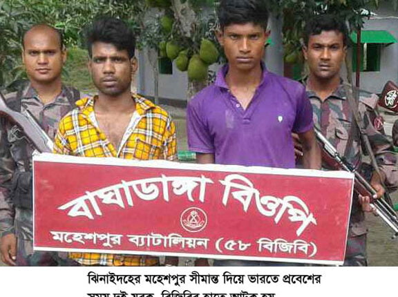 ঝিনাইদহ প্রতিনিধি: অবৈধভাবে সীমান্ত অতিক্রম করে ভারতে প্রবেশের সময় দুজনকে আটক করেছে খালিশপুর ৫৮ বিজিবি। ঝিনাইদহ জেলার মহেশপুর উপজেলার মান্দারতলা মাঠের আনিছ মিয়ার কলা বাগান থেকে তাদেরকে আটক করা হয়। এসময় বিজিবির উপস্থিতি টের পেয়ে আরও বেশ কিছু ব্যক্তি পালিয়ে যায়। আটককৃতরা হলেন মহেশপুরের বাঘাডাঙ্গা বাজারপাড়ার আজিজুল খলিফার ছেলে আফান খলিফা ও একই গ্রামের লুৎফর রহমানের ছেলে মনজুরুল ইসলাম হৃদয়। বাঘাডাঙ্গা বিওপির টহল দল সীমান্ত পিলার ৬০/৭৫-আর থেকে ১০০ গজ বাংলাদেশের অভ্যন্তরে থেকে তাদেরকে আটক করতে সক্ষম হন। ৫৮ বিজিবির সহকারী পরিচালক মোহাম্মদ নজরুল ইসলাম খাঁন সোমবার বিকেলে এক ই-মেইল বার্তায় এ তথ্য জানান। বর্তায় আরও উল্লেখ করা হয়, বিজিবির অভিযানকালে নেপাবিলা গ্রামের মস্ত মালুর ছেলে মো. মোজাহিদ, বাঘাডাঙ্গা কল্লটিপাড়ার আব্দুস সবুরের ছেলে মো. আহাদ এবং একই গ্রামের আমানুল্লার ছেলে মো. শাহিন পালিয়ে গেছে। এদের বিরুদ্ধে মহেশপুর থানায় বাংলাদেশ পাসপোর্ট অধ্যাদেশ ১৯৭৩ এর ১১(১) (গ) ধারায় মামলা দায়ের করা হয়েছে।