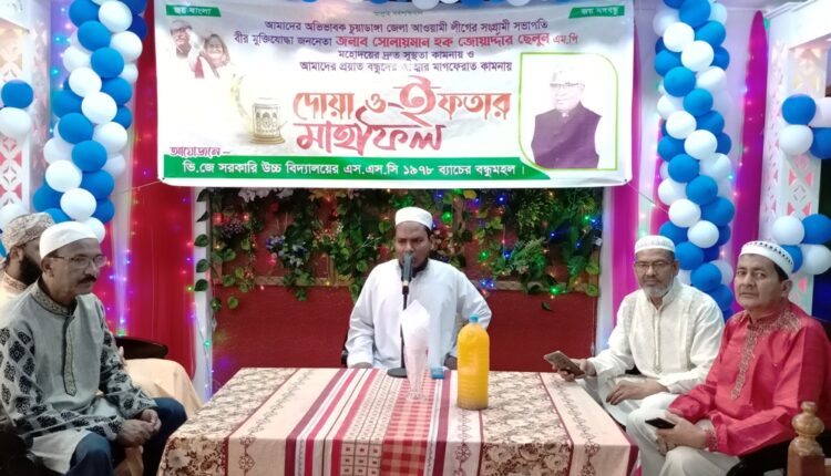 চুয়াডাঙ্গা জেলা আওয়ামী লীগের সভাপতি বীর মুক্তিযোদ্ধা সোলায়মান হক জোয়ার্দ্দার ছেলুন এমপির দ্রুত সুস্থতা কামনায় দোয়া ও ইফতার মাহফিল অনুষ্ঠিত হয়েছে। গতকাল শুক্রবার বিকেল ৫টার সময় ভি.জে সরকারি উচ্চ বিদ্যালয়ের এসএসসি ১৯৭৮ ব্যাচের আয়োজনে রেড চিলি রেস্টুরেন্টে এই দোয়া ও ইফতার মাহফিল অনুষ্ঠিত হয়। চুয়াডাঙ্গা পৌর আওয়ামী লীগের সংগ্রামী ভারপ্রাপ্ত সাধারণ সম্পাদক মো. আলাউদ্দিন হেলার সার্বিক তত্ত্বাবধানে এ অনুষ্ঠান সম্পন্ন হয়। দোয়া ও ইফতার মাহফিল অনুষ্ঠানে উপস্থিত ছিলেন জাহিদ, রাজু, শাহান, চপল, শহিদুল, লোটন, সামাদ, কাজী জুয়েল, সামাদ, হবি, খোকা, রঞ্জু, নুরু, রফিকুল, গিয়াস, টিটো, মজনু, আমিনুল, ডা. ফকির, বেবি, লাভলু, লিডার, লিটু, ডুডুম, আবু তালেব, স্যান্ডোজ ও আব্দুর রহমান। এছাড়া রিয়াজুল ইসলাম জোয়ার্দ্দার টোটন, রানা, চন্দন, নাঈমুল, আসাদ, হায়দার, বক্কর, ওল্টু, নুরুদ্দিন, মোহন, মজিদ, মারুফ, হানিফ, টুটু, এড. মিল্টন দেশের বাইরে ও চুয়াডাঙ্গার বাইরে থাকায় এই দোয়া ও ইফতার মাহফিলে অংশগ্রহণ করতে না পারায় দুঃখ প্রকাশ করেছেন এবং সোলায়মান হক জোয়ার্দ্দার ছেলুন এমপির সুস্থতা কামনায় দোয়া করেন। অনুষ্ঠানে দোয়া পরিচালনা করেন বাদুরতলা জামে মসজিদের ইমাম মাওলানা ফয়জুল্লা।