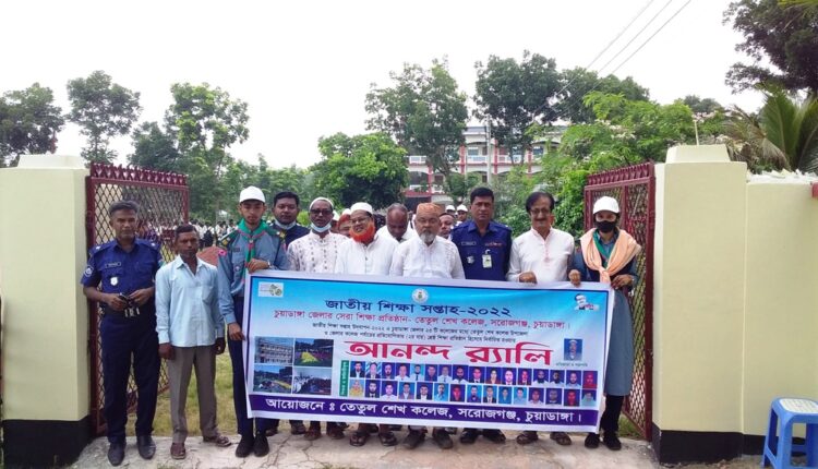 সরোজগঞ্জ প্রতিনিধি: চুয়াডাঙ্গার সরোজগঞ্জ তেতুল শেখ কলেজ জেলার শ্রেষ্ঠ শিক্ষা প্রতিষ্ঠান নির্বাচিত হওয়ায় আনন্দ র্যালি ও আলোচনাসভা অনুষ্ঠিত হয়েছে। গতকাল বুধবার সকাল ১০টার দিকে তেতুল শেখ কলেজের উদ্যোগে এ অনুষ্ঠানের আয়োজন করা হয়। সভাপতিত্ব করেন কলেজের প্রতিষ্ঠাতা ও পরিচালনা কমিটির সভাপতি হাজি আব্দুল্লা শেখ। প্রধান অতিথি ছিলেন চুয়াডাঙ্গা জেলা কৃষকলীগের সাবেক সভাপতি হাজি আজিজুল হক। বিশেষ অতিথি ছিলেন চুয়াডাঙ্গা জেলা ইটভাটা মালিক সম্পাদক ও আলিয়ারপুর আজিজ মাধ্যমিক বিদ্যালয়ের সভাপতি কলেজের জিবি সদস্য হাজি আব্দুল মোতালেব, পদ্মবিলা ইউপির সাবেক চেয়ারম্যান আবু তাহের বিশ্বাস, জিবি সদস্য জালাল উদ্দিন মহর খোকন মিয়া, সরোজগঞ্জ ক্যাম্প ইনচার্জ ইন্সপেক্টর শিকদার মতিয়ার রহমান, টুআইসি এসআই তাইফুজ্জামান, এএসআই আনোয়ার জাহিদ, মুক্তিযোদ্ধা নাসির উদ্দিন, কলেজের ভারপ্রাপ্ত অধ্যক্ষ খাইরুল ইসলাম সাবেক ভারপ্রাপ্ত অধ্যক্ষ গোলাম কিবরিয়া, কলেজের প্রভাষক শাহারিয়ার ইসলাম, আবুজার হোসেন, জাহিদুল ইসলাম, ফারুখ আহম্মেদ, রেজাউল করিম, আবু শামা, তাছলিমা পারভীন, সুরুজ আলম, আরিফ হোসেন, সুরুজ আলম, রাকিবুল হাসান, মোস্তফা শওকত ইমরান, ফারহানা পারভীন, মনিরা পারভীন, সাইফুল ইসলাম, রমিজ রাইহান, জহুর রায়হান, এনামুল হক, সাইদুর রহমান, রাজিবুল ইসলাম, রফিকুল ইসলাম, রকিব হুসাইন, আশরাফুল আলম, তরিকুল ইসলাম, হারুন অর রশিদ, কামনা রানী। বক্তারা বলেন, এইচএসসি পরীক্ষায় তেতুল শেখ কলেজ জেলা পর্যায়ে প্রতিষ্ঠাকালীন থেকে বেসরকারি প্রতিষ্ঠানে কলেজের মধ্যে থেকে ১ম স্থান অধিকার করে আসছেন। এছাড়া জাতীয় শিক্ষা সপ্তাহ ২০২২ উপজেলা পর্যায়ে অত্র প্রতিষ্ঠান থেকে হামদ/নাতে একাদশ শ্রেণির ছাত্র রুহুল আমিন, দেশাত্মবোধক গানে ঋতু শর্মা, রবীন্দ্র সঙ্গীতে দ্বাদশ শ্রেণির ছাত্রী রাজিয়া সুলতানা, জারীগান (দলভিত্তিক) একাদশ শ্রেণির ছাত্রী নাজমুন নাহার ও তার দল, লোকনৃত্য একই শ্রেণির রিক্তা খাতুন ১ম স্থান অধিকার করে। এছাড়া জেলা পর্যায়ে দ্বাদশ শ্রেণির ছাত্রী রাজিয়া সুলতানা ১ম স্থান অধিকার করে। উল্লেখ্য অত্র প্রতিষ্ঠানটি ২০১৮ সালেও চুয়াডাঙ্গা উপজেলা ও জেলার শ্রেষ্ঠ শিক্ষা প্রতিষ্ঠান নির্বাচিত হয়েছিলো।