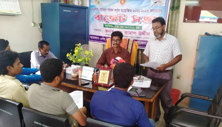 কুড়ুলগাছি প্রতিনিধি জানিয়েছেন, দামুড়হুদা উপজেলার কুড়–লগাছি ইউনিয়ন পরিষদের ২০২২-২৩ অর্থবছরের উন্মুক্ত বাজেট ঘোষণা করা হয়েছে। গত ২৭ এপ্রিল উন্মুক্ত বাজেট ঘোষণা করার জন্য ইউপি পরিষদের সদস্যবৃন্দ, সাংবাদিক ও সুধীজনের কাছ থেকে মতাতের পরিপ্রেক্ষিতে গতকাল রোববার বেলা ১১টার সময় ২৯ মে ঘোষিত বাজেটের সর্বসম্মতিক্রমে ২২,৫৭,৮৭৫ টাকা রাজস্ব, ২০,৮৩,৪৭৫ টাকা সরকারি অনুদান সংস্থাপন, ৪৩, ৪১, ৩৫০ টাকা মোট রাজস্ব প্রাপ্তি, ৯৬,৫৮,২০০ টাকা মোট উন্নয়ন অনুদান, ১,৩৯,৯৯,৫৫০ টাকা সর্বমোট বাজেট টাকা ব্যয় সম্বলিত বাজেট অত্র সভায় অনুমোদিত হয়। কুড়ুলগাছি ইউনিয়ন পরিষদ মিলনায়তনের বাজেট ঘোষণা সভায় সভাপতিত্ব করেন ইউপি চেয়ারম্যান মো. কামাল উদ্দীন। সবার উদ্দেশে বাজেট পড়ে শুনান ইউপি সচিব মো. শাহাববুবুর রহমান। এ সময় উপস্থিত ছিলেন সকল ইউপি সদস্যবৃন্দ আরো উপস্থিত ছিলেন মুক্তিযোদ্ধা, সাংবাদিক, সুধীসমাজ ও কুড়ুলগাছি বাজারের ব্যবসায়ী প্রমুখ।