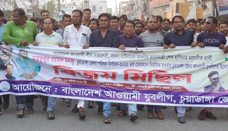 স্টাফ রিপোর্টার: চুয়াডাঙ্গা জেলা পরিষদ নির্বাচনে আওয়ামী লীগের মনোনীত প্রার্থী মাহফুজুর রহমান মনজু চেয়ারম্যান নির্বাচিত হওয়ায় বিজয় মিছিল করেছে জেলা আওয়ামী যুবলীগ। গতকাল বুধবার বিকেল সাড়ে ৪টায় মিছিলটি চুয়াডাঙ্গা টাউন ফুটবল মাঠ থেকে শুরু হয়ে শহীদ হাসান চত্বর প্রদক্ষিণ করে পূর্বের স্থানে গিয়ে শেষ হয়। মিছিলে যুবলীগের নেতাকর্মীরা পটকা ফুটিয়ে ও ‘জয় বাংলা, জয় বঙ্গবন্ধু’ সেøাগানে মুখর করে রাখে পুরো এলাকা। বিজয় মিছিলে জেলা যুবলীগের বিভিন্ন ইউনিটের নেতাকর্মীরা খ- খ- মিছিল নিয়ে টাউন মাঠে সমাবেত হয়। মিছিল শেষে টাউন ফুটবল মাঠে এক সংক্ষিপ্ত আলোচনা সভা অনুষ্ঠিত হয়। সভায় প্রধান অতিথি থেকে বক্তব্য দেন জেলা আওয়ামী যুবলীগের আহ্বায়ক ও জেলা ক্রীড়া সংস্থার সাধারণ সম্পাদক নঈম হাসান জোয়ার্দ্দার।