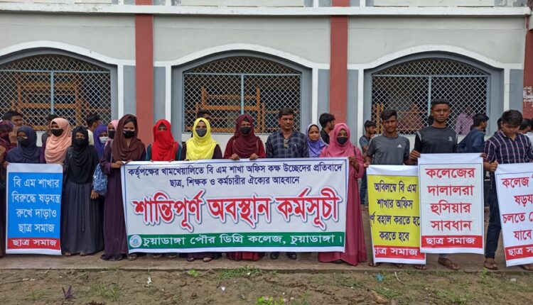 স্টাফ রিপোর্টার: চুয়াডাঙ্গা পৌর ডিগ্রি কলেজে ছাত্র শিক্ষক ও কর্মচারীর ব্যানারে অবস্থান কর্মসূচি পালন করা হয়েছে। কলেজের ব্যবসায় ব্যবস্থাপনা (বিএম) শাখা অফিসে তালা দেয়ার প্রতিবাদে গতকাল শনিবার সকাল সাড়ে ১০টার দিকে এ কর্মসূচি পালন করা হয়। অবস্থান কর্মসূচীতে উপস্থিত সাধারণ শিক্ষার্থীরা উত্তেজিত হয়ে উঠে। পরবর্তীতে ওই শাখা অফিস খুলে দিলে শান্ত হয় শিক্ষার্থীরা। এদিকে, কলেজ অধ্যক্ষ বলেছেন, ব্যবস্থপনা কমিটির সিদ্ধান্তেই তালা দেয়া হয়েছিলো। বহিরাগতদের ডেকে কলেজে মানববন্ধন করে ভাবমূর্তি ক্ষুণœ করার চেষ্টা করা হয়েছে বলেও দাবি করেন তিনি। অবস্থান কর্মসূচীতে অংশ নেয়া সাধারণ শিক্ষার্থী ও শিক্ষকরা অভিযোগ করে বলেন, চুয়াডাঙ্গা পৌর ডিগ্রি কলেজের প্রতিষ্ঠালগ্ন থেকেই বিএম শাখা ও এর আলাদা অফিস রয়েছে। কিন্তু হঠাৎ করে গত ১৮ আগষ্ট ছুটির দিন এই শাখার অফিস কক্ষ থেকে আসবাবপত্র বের করে তালা ঝুলিয়ে দেয়া হয়। অন্যান্য ডিপার্টমেন্টের আলাদা অফিস রুম থাকলেও হঠাৎ করে বিএম শাখার অফিস কেন বন্ধ করে দেয়া হলো তা কাউকে জানানো হয়নি। কিছু জামাত বিএনপির এজেন্ট ঢুকেছে কলেজে। তারাই অধ্যক্ষকে ভুল বুঝিয়ে এগুলো করাচ্ছে। অবিলম্বে বিএম শাখার অফিস কক্ষের তালা খুলে দিতে হবে। অন্যথায় অধ্যক্ষের কক্ষেও তালা ঝুলিয়ে দেয়া হবে বলে অবস্থান কর্মসূচি থেকে আল্টিমেটাম দেয়া হয়। পরবর্তীতে কলেজের অধ্যক্ষ আবু রাশেদ উপস্থিত হয়ে আন্দোলনরতদের উদ্দেশ্যে বক্তব্য রাখেন। তিনি বলেন “এটা কলেজ পরিচালনা কমিটির সিদ্ধান্ত আমার নিজের কোন সিদ্ধান্ত না। তবে আপনাদের দাবি আমি কমিটির কাছে জানাবো।” এ সময় আন্দোলনে অংশ নেয়া শিক্ষক ও শিক্ষার্থীরা চেচামেচি শুরু করে এবং বিভিন্ন সেøাগান দিতে থাকে। পরবর্তীতে অধ্যক্ষের কক্ষে সাধারণ শিক্ষক ও অধ্যক্ষের মধ্যে আলোচনা শেষে বিএম শাখার অফিস কক্ষের তালা খুলে দেয়া হয়। এদিকে চুয়াডাঙ্গা পৌর ডিগ্রি কলেজের বিএম শাখার অফিস কক্ষ বন্ধ করে দেয়ার বিষয়ে জানতে চাওয়া হলে অধ্যক্ষ আবু রাশেদ দৈনিক মাথাভাঙ্গাকে বলেন, কলেজের ব্যবস্থপনা কমিটির সিদ্ধান্তেই ওই অফিসে তালা দেয়া হয়েছিল। কলেজে কারিগরি ও বিএম শাখার আলাদা অফিস। সব শিক্ষককে এক জায়গায় করার জন্য এই সিদ্ধান্ত নেয়া হয়। কিন্তু সাধারণ শিক্ষার্থীদের ভুল বুঝিয়ে ও বহিরাগতদের ডেকে কলেজে মানববন্ধন করে আমার ভাবমূর্তি ক্ষণœ করার চেষ্টা করা হয়েছে। দু-চারজন বাদে মানববন্ধনে অংশ নেয়া সবাই বহিরাগত বলে দাবি করেন তিনি।