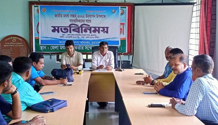চুয়াডাঙ্গায় জাতীয় মৎস্য সপ্তাহ ২০২২ উদযাপন উপলক্ষে গণমাধ্যম কর্মীদের সাথে মতবিনিময় সভা অনুষ্ঠিত হয়েছে। গতকাল শসিবার বেলা ১১টায় জেলা মৎস্য কার্যালয়ে এ মতবিনিময় সভা অনুষ্ঠিত হয়। মতবিনিময় সভায় জেলা মৎস্য কর্মকর্তা দীপক কুমার পাল সপ্তাহব্যাপী মৎস্য সপ্তাহের কর্মসূচি উপস্থাপন করেন। এ সময় জেলা মৎস্য অফিসের সিনিয়র সহকারী পরিচালক মো. রবিউল ইসলাম, সম্প্রসারণ কর্মকর্তা আব্দুস সাত্তার ও জেলায় কর্মরত গণমাধ্যম কর্মীরা উপস্থিত ছিলেন। মতবিনিময় সভায় জানানো হয়, চুয়াডাঙ্গা জেলায় মোট জলায়তন ৬ হাজার ৫০০ হেক্টর, পুকুরের সংখ্যা ১১ হাজার ৫৮টি এবং আয়তন ২ হাজার ৬৫০ হেক্টর, পুকুর-দিঘির উৎপাদন ১৫ হাজার ৪০৭ মে.টন, বাওরের সংখ্যা ১০ (আয়তন ৪৯৯ হে:) , বাওরে মাছ উৎপাদন ১ হাজার ৭৭২ মে. টন, নদীর সংখ্যা ১২টি, নদীতে মাছ আহরণ ৬০৯ মে. টন, বিলের সংখ্যা ১ (আয়তন ১৫২৫ হে.), বিলে মাছ উৎপাদন ৩ হাজার ৩৩১ মে.টন, মৎস্যজীবীর সংখ্যা ৫ হাজার ৮৭ জন, মৎস্য চাষির সংখ্যা ৮ হাজার ৪২৬ জন, প্রশিক্ষণপ্রাপ্ত মৎস্যচাষির সংখ্যা ১ হাজার ১২০ জন, মৎস্য হ্যাচারির সংখ্যা ২টি, বার্ষিক মাছ উৎপাদন ২৩ হাজার ৭৩০ মে.টন, বার্ষিক মাছের চাহিদা ২৫ হাজার ২৪৫ মে.টন এবং বার্ষিক মাছের ঘাটতি ১ হাজার ৫১৫ মে. টন, কার্ডধারী জেলের সংখ্যা ৪ হাজার ৩৫৬ জন এবং মৎস্যজীবী সমিতির সংখ্যা ৪৪টি।