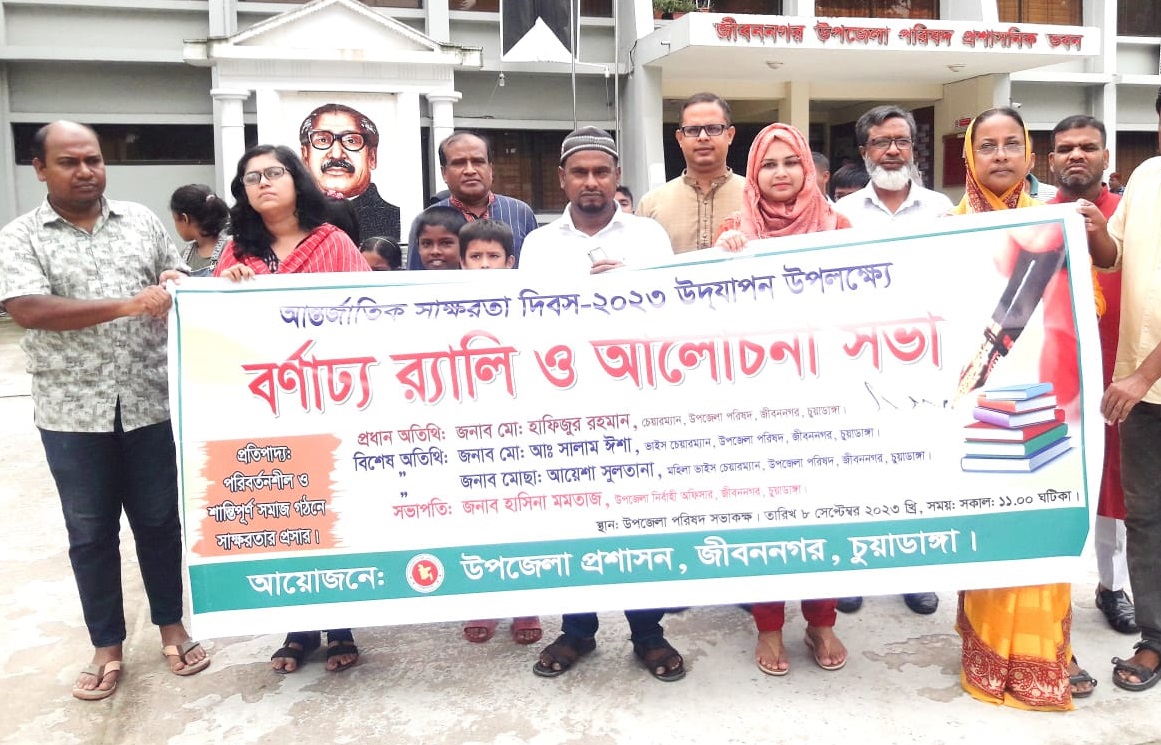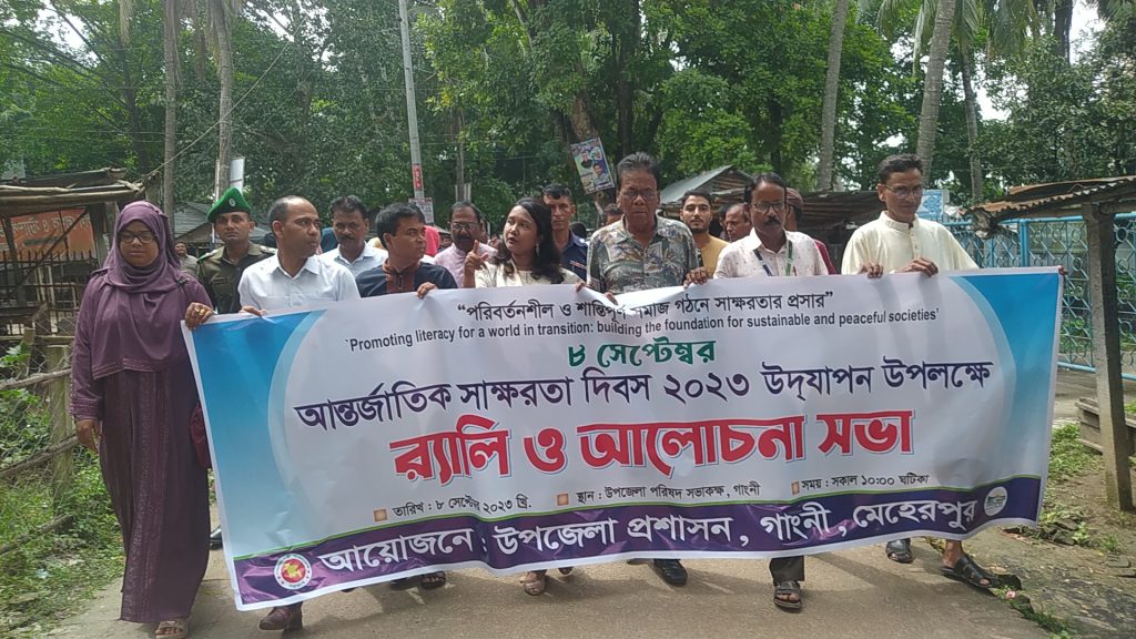 মেহেরপুর অফিস জানিয়েছে, মেহেরপুরের জেলা প্রশাসনের উদ্যোগে আন্তর্জাতিক সাক্ষরতা দিবস উপলক্ষ্যে র্যালি ও আলোচনাসভা অনুষ্ঠিত হয়েছে। গতকাল শুক্রবার সকালে এ আলোচনাসভা ও র্যালি অনুষ্ঠিত হয়। জেলা প্রশাসক মো. শামীম হাসানের সভাপতিত্বে মেহেরপুর জেলা প্রশাসকের সম্মেলন কক্ষে অনুষ্ঠিত আলোচনাসভায় বক্তব্য রাখেন অতিরিক্ত জেলা ম্যাজিস্ট্রেট তানভীর আহমেদ রুম্মন, জেলা নির্বাচন অফিসার ওলিউর রহমান, জেলা ইসলামিক ফাউন্ডেশনের উপ-পরিচালক এ জে এম সিরাজুম মনির, সহকারী প্রাথমিক শিক্ষা অফিসার অলিউর রহমান প্রমুখ। এদিকে এর আগে আন্তর্জাতিক সাক্ষরতা দিবস উপলক্ষে একটি র্যালি বের করা হয়। জেলা প্রশাসক মো. শামীম হাসানের নেতৃত্বে র্যালিটি মেহেরপুর পাবলিক লাইব্রেরী চত্বর থেকে শুরু করে প্রধান সড়ক প্রদক্ষিণ শেষে জেলা প্রশাসকের কার্যালয় চত্বরে গিয়ে শেষ হয়।