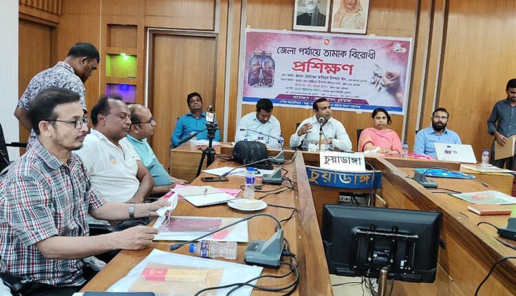 গতকাল সোমবার দুপুর ১২টায় চুয়াডাঙ্গা জেলা প্রশাসকের সম্মেলন কক্ষে অতিরিক্ত জেলা ম্যাজিস্ট্রেট মো. আরাফাত রহমানের সভাপতিত্বে অনুষ্ঠিত তামাকবিরোধী প্রশিক্ষণ অনুষ্ঠানে প্রধান অতিথির বক্তব্যে জেলা প্রশাসক আরো বলেন, ‘পাবলিক প্লেসে ধুমপান বিরোধী অভিযান আরো জোরদার করা হচ্ছে। সরকারের নির্দেশনায় সচেতনমূলক কর্মসূচি বাস্তবায়ন ও অভিযানের ফলে গণপরিবহনসহ পাবলিক প্লেসে প্রকাশ্যে ধুমপানের মাত্রা বহুলাংশে হ্রাস পেয়েছে। শিক্ষা প্রতিষ্ঠানগুলোতে শিক্ষার্থীদের মধ্যে মাদকের ভয়াবহতা সম্পর্কে সচেতনতার আলো ছড়িয়ে সৃজনশীল কাজে আগ্রহী করে তোলার জন্য শিক্ষকম-লীকে বেশি বেশি কর্তব্যপরায়ন হওয়া প্রয়োজন। কৃষি সম্প্রসারণের মাধ্যমে কৃষকদের তামাক চাষে নিরুৎসাহিত করতে হবে। তামাক চাষে আর্থিক লাভবান হলেও চাষি নিজেরও স্বাস্থ্যগত ঝুঁিক বাড়ে। জমিও হারায় উর্বরতা।’