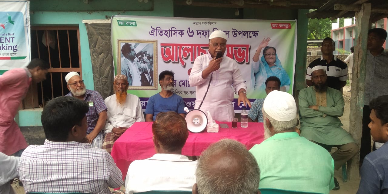 এদিকে ঐতিহাসিক ৬ দফা দিবস উপলক্ষ্যে আলোচনাসভা করেছেন চুয়াডাঙ্গা জেলা আওয়ামী লীগের সাবেক সহ-সভাপতি ও সদর উপজেলা চেয়ারম্যান আসাদুল হক বিশ্বাস। গতকাল বুধবার বিকেলে আলমডাঙ্গা উপজেলার পাঁচলিয়া বাজারে এ আলোচনাসভা অনুষ্ঠিত হয়। আলোচনাসভায় সভাপতিত্ব করেন জামজামি ইউনিয়ন আওয়ামী লীগ নেতা মিজানুর রহমান মিজান। প্রধান অতিথি ছিলেন জেলা আওয়ামী লীগের সাবেক সহ-সভাপতি ও সদর উপজেলা চেয়ারম্যান আসাদুল হক বিশ্বাস। জেলা স্বেচ্ছাসেবক লীগের সদস্য মো. পাপেলের সভাপতিত্বে আলোচনা সভায় আরও বক্তব্য রাখেন, আলমডাঙ্গা উপজেলা উপজেলা কৃষকলীগ নেতা হায়দার আলী, কালিদাসপুর ইউনিয়ন যুবলীগের সাবেক আহ্বায়ক মনিরুজ্জামান মনির, জেলা শ্রমিকলীগের যুগ্মসাধারণ সম্পাদক মুক্তার হোসেন মিলন, পাঁচলিয়া জামালউদ্দীন মাধ্যমিক বিদ্যালয়ের প্রধান শিক্ষক চান্দু মিয়া। এ সময় স্থানীয় আওয়ামী লীগ, যুবলীগ, স্বেচ্ছাসেবক লীগ ও ছাত্রলীগের নেতাকর্মীরা উপস্থিত ছিলেন।