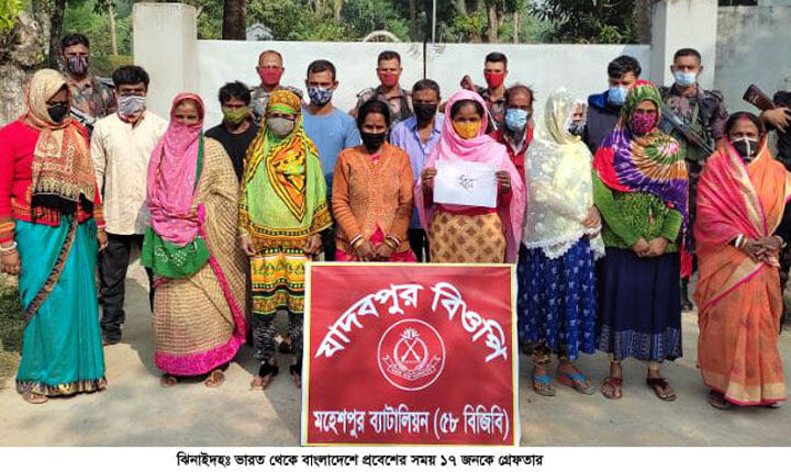 মহেশপুর প্রতিনিধি: ঝিনাইদহের মহেশপুর যাদবপুর সীমান্ত দিয়ে অবৈধভাবে ভারত থেকে বাংলাদেশে অনুপ্রবেশকালে নারী ও শিশুসহ ১৭ জনকে আটক করেছে বিজিবি। গতকাল সোমবার ভোররাতে উপজেলার কানাইডাঙ্গা গ্রামের একটি কলা বাগানের ভেতর থেকে তাদেরকে আটক করা হয়। ৫৮ বিজিবি’র অতিরিক্ত পরিচালক তসলিম মো. তারেক এ তথ্য নিশ্চিত করেছেন।