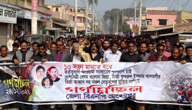 মেহেরপুর অফিস: কেন্দ্রীয় ঘোষিত কর্মসূচির অংশ হিসেবে নির্দলীয় নিরপেক্ষ তত্ত্বাবধায়ক সরকারের অধীনে নির্বাচনসহ ১০ দফা দাবি বাস্তবায়ন এবং বেগম খালেদা জিয়া, মির্জা ফখরুল ইসলাম আলমগীর ও মির্জা আব্বাসসহ নেতৃবৃন্দের মুক্তির দাবিতে মেহেরপুরে জেলা বিএনপি’র সভাপতি ও সাবেক এমপি মাসুদ অরুনের নেতৃত্বে জেলা বিএনপি এবং অঙ্গ ও সহযোগী সংগঠনের নেতাকর্মীরা গণমিছিল ও সমাবেশ করেছে। গতকাল শনিবার সকাল সাড়ে দশটার দিকে মেহেরপুর সহিউদ্দিন ডিগ্রি কলেজ মোড় থেকে গণমিছিল বের করে প্রধান সড়ক প্রদক্ষিণ শেষে মিছিলটি কাথুলী বাসস্ট্যান্ডে এসে শেষ হয়। পরে সেখানে সমাবেশ করা হয়। এ সময় পৌর বিএনপি’র সভাপিত জাহাঙ্গীর বিশ্বাসের সঞ্চালনায় প্রধান অতিথি হিসেবে বক্তব্য রাখেন কেন্দ্রীয় নির্বাহী কমিটির সদস্য ও মেহেরপুর জেলা বিএনপি’র সভাপতি সাবেক এমপি মাসুদ অরুন।