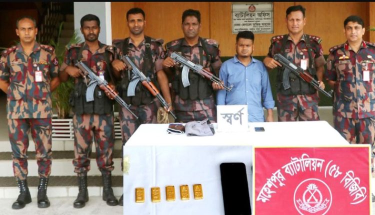 মহেশপুর বিজিবি জানায়, চুয়াডাঙ্গার সীমান্ত শহর দর্শনায় অভিযান চালিয়ে মো. সেলিম (৩৩) নামের এক স্বর্ণ পাচারকারীকে আটক করেছে বাংলাদেশ বর্ডার গার্ড (৫৮ বিজিবি)। এ সময় তার শরীর তল্লাশি করে পাঁচটি স্বর্ণের বার উদ্ধার করা হয়েছে। আটক মো. সেলিম কুমিল্লা জেলার হোমনা থানাধীন নিলখী গ্রামের মো. রওশন আলীর ছেলে। গতকাল সোমবার দুপুরে মহেশপুর ব্যাটালিয়নের (৫৮ বিজিবি) সহকারী পরিচালক মোহাম্মদ সাইফুল ইসলাম এ তথ্য নিশ্চিত করেন। তিনি জানান, নিজস্ব গোয়েন্দা তথ্যের ভিত্তিতে জানা যায় যে, এক ব্যক্তি ভ্যানযোগে দর্শনা রেলস্টেশন এলাকা দিয়ে স্বর্ণ পাচারের উদ্দেশ্যে দর্শনা-মুজিবনগর রাস্তা হয়ে সীমান্তের দিকে যাবে। এই তথ্যের ভিত্তিতে ব্যাটালিয়ন সদরের একটি বিশেষ টহল দল দর্শনা রেলস্টেশন এলাকায় অবস্থান করে। গতকাল সোমবার সকাল ৯টায় একজন সন্দেহভাজন ব্যক্তি দর্শনা রেলস্টেশন অতিক্রম করে দর্শনা-মুজিবনগর রাস্তা হয়ে সীমান্তের দিকে যেতে দেখে সন্দেহ হয় টহল দলের। পরে তাকে তল্লাশি করে প্যান্টের কোমরের ভেতরে বিশেষ কায়দায় পকেটের মধ্যে লুকায়িত অবস্থায় ৫৮৩ দশমিক ২০ গ্রাম ওজনের ৫টি স্বর্ণের বার জব্দ করা হয়। এছাড়াও ১টি মোবাইলফোনসহ সেলিম নামে চোরাকারকারিকে গ্রেফতার করতে সক্ষম হয়। জব্দ করা এসব স্বর্ণেরবারের বাজার মূল্য প্রায় ৪৮ লাখ ৫০ হাজার টাকা। তিনি আরও জানান, স্বর্ণেরবারের শুল্ক কর ফাঁকি দিয়ে ভারতে পাচারের উদ্যেশ্যে পরিবহন করা ও নিজ জিম্মায় রাখার অপরাধে অভিযুক্ত ব্যক্তিকে আটক করা হয়। আটক সাইফুল ইসলামের বিরুদ্ধে দর্শনা থানায় মামলা দায়েরসহ জব্দকৃত স্বর্ণেরবার চুয়াডাঙ্গা ট্রেজারি অফিসে জমা হয়েছে। অপরদিকে পার্বতীপুর হতে খুলনাগামী রকেট মেইল ট্রেন থেকে সাত লাখ টাকার ভারতীয় হেরোইন উদ্ধার করেছে চুয়াডাঙ্গা ৬ ব্যাটালিয়ন বিজিবি। গতকাল সোমবার সকালে দর্শনা কোম্পানির একটি বিশেষ টহল দল দর্শনা হল্ট স্টেশনে অবস্থান করে। ট্রেনটি স্টেশনে পৌঁছালে তৃতীয় বগির ভেতরের ক্যারিয়ারের ওপর থেকে একটি পলিথিনের ব্যাগ তল্লাশি করা হয়। পরে এর মধ্যে থেকে সাড়ে ৩শ’ গ্রাম ভারতীয় হেরোইন জব্দ করা হয়। জব্দ করা হেরোইনের অনুমানিক মূল্য ৭ লাখ টাকা। চুয়াডাঙ্গা-৬ বিজিবির পরিচালক লেফটেন্যান্ট কর্নেল সাঈদ মোহাম্মদ জাহিদুর রহমান বিষয়টি নিশ্চিত করেছেন। তিনি জানান, পার্বতীপুর থেকে খুলনা অভিমুখী ছেড়ে আসা রকেট মেইল ট্রেনে ভারতীয় হেরোইন পাচার করা হবে এমন গোপন তথ্যের ভিত্তিতে দর্শনা বিওপি কমান্ডার সুবেদার নওশের আলী সঙ্গীয় ফোর্স নিয়ে সীমান্ত পিলার ৭৭/২-এস থেকে আনুমানিক সাড়ে তিন কিলোমিটার বাংলাদেশের ভেতরে দর্শনা রেলস্টেশনে রাত দেড়টায় মাদক বিরোধী অভিযান পরিচালনা