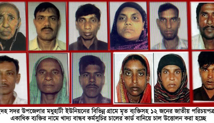 ঝিনাইদহ প্রতিনিধি: লাইলী বেগম মারা গেছেন ১০-১২ বছর আগে। ঝিনাইদহ সদর উপজেলার মধুহাটি ইউনিয়নের গোপালপুর গ্রামের মৃত আব্দুল জলিলের স্ত্রী তিনি। অথচ এ মৃত ব্যক্তির জাতীয় পরিচয়পত্র (৪৪১১৯৫২০৯০৪৯৫) ব্যবহার করে মধুহাটি ইউনিয়নের বিভিন্ন গ্রামের একাধিক ব্যক্তি ১০ টাকা কেজি দরের চাল উত্তোলন করছেন। মুসলিম জাতীয় পরিচয়পত্র দিয়ে হিন্দু ও হিন্দু ব্যক্তির জাতীয় পরিচয়পত্র দিয়ে মুসলমানদের তালিকা করা হয়েছে। এক গ্রামের জাতীয় পরিচয়পত্র অন্য গ্রামে ব্যবহার করা হয়েছে। নারীর আইডি দিয়ে পুরুষ আর পুরুষের আইডি ব্যবহার করে নারীর চালের কার্ড বানানো হয়েছে। এভাবে ওই ইউনিয়নে ১০-১২ জনের জাতীয় পরিচয়পত্র ব্যবহার করে অর্ধশত ব্যক্তির চালের কার্ড করা হয়েছে। চেয়ারম্যান, কতিপয় মেম্বার ও দুই ডিলার বছরের পর বছর ধরে জাল জোচ্চুরির মাধ্যমে গরিব মানুষের জন্য বরাদ্দকৃত এ চাল নামে বেনামে তুলে নিচ্ছেন। ইউনিয়নের দুই ডিলার নয়ন ও ইন্তা ওজনেও কম দিচ্ছেন বলে উপকারভোগীরা অভিযোগ করেন। সুনির্দিষ্ট লিখিত অভিযোগের প্রেক্ষিতে সরেজমিন তদন্ত করে এই দুর্নীতি ও অনিয়মের চিত্র পাওয়া গেছে। এদিকে ঝিনাইদহ জেলা প্রশাসক ও উপজেলা নির্বাহী কর্মকর্তার বরাবর মধুহাটি ইউনিয়নের কুবিরখালী গ্রামের রফিকুল ইসলাম নুরুল ইসলাম ও দুর্গাপুর গ্রামের বদর উদ্দীন লিখিত অভিযোগ দেয়ার পর চালের কার্ড হারানার গণ জিডি করা হয়েছে ঝিনাইদহ সদর থানায়। দুর্নীতি, অপকর্ম ও একজনের চাল অন্যজন তুলে নেয়ার তথ্য আড়াল করার জন্য এ জিডি করা হচ্ছে বলে অভিযোগ উঠেছে। এদিকে ঝিনাইদহ জেলা প্রশাসনের নির্বাহী ম্যাজিস্ট্রেট আবু সালেহ মোহাম্মদ হাসনাত অভিযোগ তদন্তে রোববার মধুহাটি ইউনিয়ন পরিদর্শন করেন। এসময় তিনি অভিযোগকারীদের বক্তব্য রেকর্ড করেন। অনেকেই তার কাছে চাল পাচ্ছেন না বলে অভিযোগ করেন। তবে মধুহাটি ইউনিয়নের চেয়ারম্যান ফারুক আহম্মেদ জুয়েল বলেছেন, ১ হাজার ২৪১টি তালিকা করতে গিয়ে কম্পিউটারে টাইপিং মিসিং হতে পারে। এগুলো সংশোধন করে বাদ দেয়া হয়েছে। সরেজমিন তদন্ত করে জানা গেছে, ১০-১২ বছর আগে মারা যাওয়া মৃত লাইলী বেগমের জাতীয় পরিচয়পত্র ব্যবহার করে গোপালপুরের আব্দুলের ছেলে আমিরুল, একই গ্রামের রুহুল আমিনের স্ত্রী রেশমা খাতুন, আইয়ুব হোসেনের ছেলে মিন্টু মিয়া, মির্জাপুর গ্রামের ইসমাইলের ছেলে আক্তার হোসেন, নওদাপাড়া গ্রামের বিশারতের ছেলে মোশারেফ, বদর উদ্দীনের ছেলে নুর ইসলাম, কুবির খালী গ্রামের বুদোই ম-লের ছেলে কলিম উদ্দীন, একই গ্রামের জাবেদ আলীর স্ত্রী শাহেদা বেগম, ওয়াড়িয়া গ্রামের হালদারের ছেলে সম্ভু হালদার ও একই গ্রামের বদরের ছেলে বাবলুসহ একাধিক ব্যক্তির নামে খাদ্য বান্ধব কর্মসূচির ১০ 
