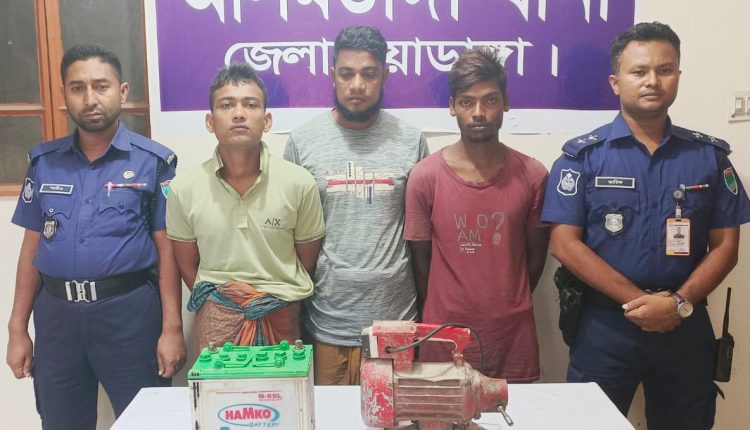 জানা গেছে, উপজেলার বেলগাছি ইউনিয়নের ফরিদপুর দোয়ারপাড়ার কুদ্দুস মোল্লার ছেলে মামুন আলী ওরফে পারুল (২৯), মুন্সিগঞ্জ রেললাইনের ঢালের নবী শেখের ছেলে সবুজ শেখ (২৩) এলাকার চিহ্নিত চোর। তারা এলাকায় গভীর রাতে পাঁচিল টপকিয়ে মানুষের বাড়িতে প্রবেশ করে সাইকেল, পানি উঠানো মোটর (পাম্প), পাখিভ্যানের ব্যাটারিসহ বিভিন্ন প্রয়োজনীয় দামি জিনিস চুরি করে। চোরাই মালামাল হাউসপুর হঠাৎপাড়ার গ্রামের বজলুর রহমানের ছেলে ভাংড়ী ব্যবসায়ী রাসেল আলীর (৪২) নিকট বিক্রি করে থাকে। গত ৪ আগস্ট দিনগত রাতে আলমডাঙ্গা পৌর এলাকার ওয়াপদা কলোনী থেকে বিশিষ্ট ঠিকাদার পৌর কাউন্সিলর আলাল উদ্দিন ও তার বড় ভাইয়ের ঠিকাদারী মালামালের গোডাউন থেকে একটি কংক্রিট ভাইব্রেটিং মেশিন চুরি করে মামুন ওরফে পারুল। ইতোপূর্বে মামুন ওরফে পারুলের নামে চুরি, ছিনতাই মামলা রয়েছে। মামুন ভাইব্রেটিং মেশিনটি নিয়ে ৫শ ৫০ টাকায় বিক্রি করে। ইতোমধ্যে পুলিশ জানতে পারে যে সকল চোরের হোতা ভাংড়ী ব্যবসায়ী রাসেল। রাসেল কিছুদিন আগে চোরাই মোটরসাইকেলসহ পুলিশের হাতে আটক হয়েছিলো। তার নামেও রয়েছে চুরি মামলা। সবুজ শেখ সুযোগ সন্ধানী চোর। সুযোগ বুঝে সামনে যা কিছু পায় তাই চুরি করে বিক্রি করে। সোমবার দুপুরে আলমডাঙ্গা থানার এসআই তারিফুজ্জামান ও এএসআই রওশন অভিযান চালিয়ে চোরাই মালামালসহ মামুন, সবুজ শেখ ও রাসেলকে আটক করে। তাদের বিরুদ্ধে আলমডাঙ্গা থানায় নিয়মিত মামলা দায়ের করা হয়েছে।