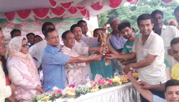 আলমডাঙ্গা ব্যুরো: আলমডাঙ্গা কুমারী চাষি ক্লাবের আয়োজনে ফুটবল টুর্নামেন্ট ফাইনাল-২০২২ খেলা অনুষ্ঠিত হয়েছে। গতকাল ২০ মে শুক্রবার বিকেলে কুমারী ফুটবল মাঠে আলমডাঙ্গা ফ্রেন্ডস ক্লাব বনাম চুয়াডাঙ্গা মামা ভাগ্নে ক্লাব ফাইনাল খেলায় অংশগ্রহণ করে। নির্ধারিত সময়ের খেলায় ৩-৩ সমতা হওয়ায় ট্রাইবেকারে আলমডাঙ্গা ফ্রেন্ডস ক্লাব ৬-৫ গোলে মামা ভাগ্নে ক্লাবকে হারিয়ে জয়লাভ করে। খেলা শেষে পুরস্কার বিতরণ অনুষ্ঠানে কুমারী ইউনিয়ন আওয়ামীলীগের সভাপতি ও ইউপি চেয়ারম্যান আবু সাঈদ পিন্টুর সভাপতিত্বে প্রধান অতিথি ছিলেন জেলা আ.লীগের যুগ্ম সাধারণ সম্পাদক ও চুয়াডাঙ্গার পৌরসভার সাবেক মেয়র রিয়াজুল ইসলাম জোয়ার্দ্দার টোটন। এসময় তিনি বলেন, ভালো খেলা খেলতে হলে নিয়মিত অনুশীলন করতে হবে। নিজেকে যত ভাল খেলোয়াড় মনে করো না কেন, যতোই স্টেজে মারার চেষ্টা করো না কেন, নিয়মিত অনুশীলন না করলে ভালো ফলাফল আসবে না। তাই নিয়মিত অনুশীলনের বিকল্প নেই। মূল কথা হলো খেলাধুলা খেললে শরীর মন যেমন ভালো থাকে, তেমনই যুব সমাজকে মাদক ও বিপথগামিতা থেকে দূরে রাখে। ফলে খেলাধুলার মাধ্যমে একজন আদর্শ ও ভালো মনের মানুষ হয়ে গড়ে ওঠা যায়। পুরস্কার বিতরণী অনুষ্ঠানে বিশেষ অতিথি ছিলেন পৌর মেয়র হাসান কাদির গনু, উপজেলা আওয়ামীলীগের সভাপতি আবু মুছা, আলমডাঙ্গা থানার অফিসার ইনচার্জ সাইফুল ইসলাম, পুলিশ পরিদর্শক তদন্ত আব্দুল আলীম, কুমারী ইউনিয়ন আওয়ামীলীগের সাধারণ সম্পাদক আব্দুর রাজ্জাক, আওয়ামীলীগ নেতা অ্যাড. মোখলেছুর রহমান, পৌর কাউন্সিলর খন্দকার মজিবুল ইসলাম। উপজেলা আওয়ামীলীগের সাবেক প্রচার সম্পাদক মাসুদ রানা তুহিনের উপস্থাপনায় উপস্থিত ছিলেন আলমডাঙ্গা ফ্রেন্ডস ক্লাবের সাবেক খেলোয়ার শরিফুল ইসলাম, লিল্টু, অ্যাড. লাল্টু, প্রভাষক মিজানুর রহমান, আলী আজগর সাচ্চু, মীর উজ্জল, মুন্না, সুমীত কুমার, কুমারী ইউপি সদস্য শরিফুল ইসলাম, মাহাবুল ইসলাম, আব্দুর রশিদ, জেলা যুবলীগ নেতা শেখ সেলিম, সোহেল রানা, আনিস, সেলিম জিন্নাহ। খেলায় রেফারির দায়িত্ব পালন করেন মুজিবনগর থেকে আগত সোহেল রানা, সালমান খান ও জাহাঙ্গীর আলম। ধারাবিবরণী প্রদান করেন আবুল কালাম আজাদ ও রাজ কুমার। খেলা শ্রেষ্ঠ দর্শক, ম্যান অব দ্যা ম্যাচ ও সিরিজের পুরস্কার প্রদান করেন মন্ডল স্পোর্টসের মন্ডল।