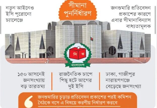 ইসির সাবেক অতিরিক্ত সচিব জেসমিন টুলী জানিয়েছেন, জনসংখ্যার সমতা ও আঞ্চলিক অখ-তা সমন্বয় করতে গিয়ে প্রতিবারই বিপাকে পড়ে কমিশন। ২০০৮ সালে ১৩৩ আসনের সীমানা পরিবর্তনের কাজে সম্পৃক্ত থাকা ইসির এই সাবেক কর্মকর্তা জানান, ইতোমধ্যে জনশুমারির প্রাথমিক প্রতিবেদন প্রকাশ হয়েছে। পূর্ণাঙ্গ প্রতিবেদন পাওয়া গেলে সীমানা নির্ধারণের কাজে হাত দেওয়া বর্তমান ইসির জন্য বাধ্যতামূলক হবে।