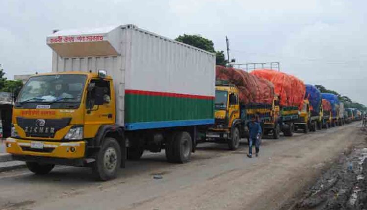 শুক্রবার (২৪ জুলাই) দৌলতদিয়া ঘাটে আটকা পড়ে ঢাকাগামী বিভিন্ন পণ্যবোঝাই শত শত ট্রাক। এতে ঘাটের জিরোপয়েন্ট থেকে দৌলতদিয়া-খুলনা মহাসড়কের বাংলাদেশ হ্যাচারিজ পর্যন্ত চার কিলোমিটার রাস্তায় ট্রাকের দীর্ঘ সারি সৃষ্টি হয়। মাত্র তিন কিলোমিটার দীর্ঘ ওই নৌপথ পাড়ি দিতে এসে দিনের পর দিন সিরিয়ালে আটকে থাকায় চরম ভোগান্তির শিকার হচ্ছেন ট্রাকচালকরা। বিআইডাব্লিউটিসির দৌলতদিয়া ঘাট অফিস ও স্থানীয় সূত্রে জানা যায়, ঈদ ঘনিয়ে আসছে। ঘরমুখো মানুষের দুর্ভোগ লাঘবে ঈদের তিন দিন আগে থেকে পরের তিন দিন এই নৌপথে কোরবানির পশুসহ অত্যাবশ্যকীয় পণ্যবাহী ট্রাক ছাড়া অপর সকল ট্রাক ও কাভার্ডভ্যান পারাপার বন্ধ থাকবে। তাই দৌলতদিয়া ঘাটে ঢাকাগামী বিভিন্ন পণ্যবাহী ট্রাক ও কাভার্ডভ্যানের চাপ বেড়েছে। এদিকে প্রচন্ড স্রোতের কারণে নৌপথে চলাচলকারি ফেরিগুলো স্বাভাবিক গতিতে চলতে পারছে না। পারাপারে সময় অনেক বেশি লেগে যাওয়ায় ফেরির ট্রিপ সংখ্যা আগের চেয়ে অনেক কমে গেছে।