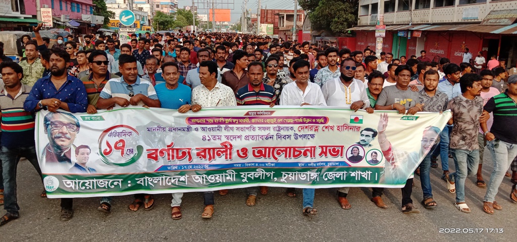 চুয়াডাঙ্গায় জেলা যুবলীগের উদ্যোগে প্রধানমন্ত্রী শেখ হাসিনার ৪১তম স্বদেশ প্রত্যাবর্তন দিবস পালন করা হয়েছে। দিবসটি পালন উপলক্ষে গতকাল মঙ্গলবার এক বর্ণাঢ্য র্যালি, আলোচনা সভা ও দোয়া অনুষ্ঠানের আয়োজন করে বাংলাদেশ আওয়ামী যুবলীগ চুয়াডাঙ্গা জেলা শাখা। বিকেল সাড়ে ৪টায় জেলা যুবলীগের আহ্বায়ক ও জেলা ক্রীড়া সংস্থার সাধারণ সম্পাদক নঈম হাসান জোয়ার্দ্দারের নেতৃত্বে একটি র্যালি বের হয়। র্যালিটি স্থানীয় যুবলীগ কার্যালয় থেকে শুরু হয়ে শহীদ হাসান চত্বর, কোর্ট মোড়, কলেজ রোড, কবরী রোডসহ শহরের প্রধান প্রধান সড়ক প্রদক্ষিণ করে পূর্বের স্থানে এসে শেষ হয়। পরে নেতা-কর্মীরা যুবলীগের স্থানীয় কার্যালয়ে আলোচনা সভায় মিলিত হয়। চুয়াডাঙ্গা জেলা যুবলীগের সদস্য আলমগীর আজম খোকার সভাপতিত্বে সমাবেশে প্রধান অতিথি হিসেবে উপস্থিত ছিলেন জেলা যুবলীগের আহ্বায়ক ও জেলা ক্রীড়া সংস্থার সাধারণ সম্পাদক নঈম হাসান জোয়ার্দ্দার।