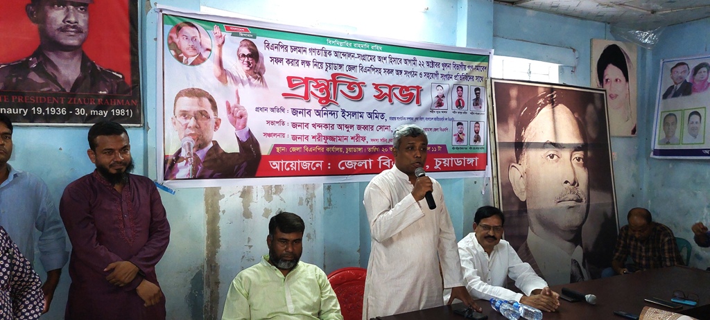 চুয়াডাঙ্গা জেলা বিএনপির সদস্য সচিব শরীফুজ্জামান শরীফের সঞ্চালনায় বক্তব্য রাখেন বিএনপি নেতা নজরুল ইসলাম, আবু বক্কর সিদ্দিক আবু ও মীর্জা ফরিদুল ইসলাম শিপলু, মৎস্যজীবী দলের আহবায়ক আবু বক্কর বকুল, জাসাসের সাধারণ সম্পাদক সেলিমুল হাবিব, যুবদলের সাধারণ সম্পাদক সাইফুর রশিদ ঝন্টু ও ছাত্রদলের সাধারণ সম্পাদক মোমিন মালিতা বক্তব্য রাখেন।