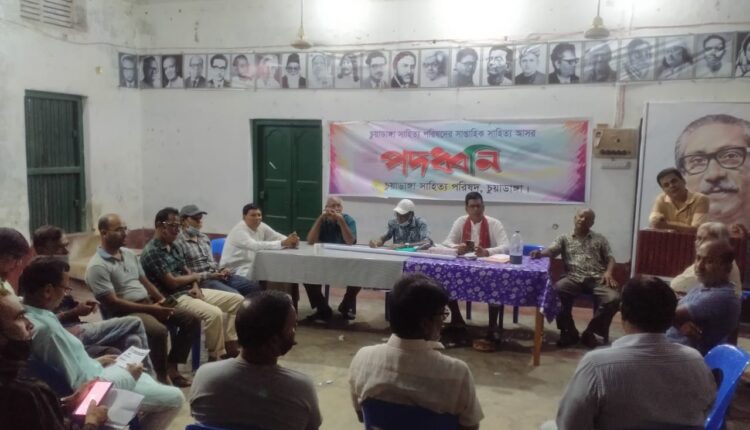 স্টাফ রিপোর্টার: চুয়াডাঙ্গা সাহিত্য পরিষদের নিয়মিত সাপ্তাহিক সাহিত্য আসর পদধ্বনি অনুষ্ঠিত হয়েছে। গত শুক্রবার বিকেলে চুয়াডাঙ্গা সহিত্য পরিষদ সংলগ্ন শহীদ আলাউল হলে এক হাজার ৪৬০ সাহিত্য আসরের আয়োজন করা হয়। এতে সভাপতিত্ব করেন পরিষদের সভাপতি কবি নজমুল হেলাল। শুভেচ্ছা বক্তব্য দেন পরিষদের সাধারণ সম্পাদক নজির আহমেদ। স্বরচিত লেখা পাঠ করেন কবি গোলাম কবীর মুকুল, আহাদ আলী মোল্লা, সার্থক আলীম, আনছার আলী, হুমায়ুন কবীর, আবু নাসিফ খলিল, সুমন মালিক, নাঈমুর রহমান, ডা. তোফাজ্জল হোসেন, জামাল উদ্দীন বেঙ্গলী, নুরুজ্জামান, এমএ মামুন, হারুন অর রশিদ ও নজমুল হেলাল। স্বরচিত লেখার ওপর আলোচনা করেন চুয়াডাঙ্গা সাহিত্য পরিষদের উপদেষ্টা চুয়াডাঙ্গা সরকারি কলেজের বাংলা বিভাগের সহযোগী অধ্যাপক মুন্সি আবু সাইফ। অনুষ্ঠানটি সঞ্চালনা করেন পরিষদের দপ্তর সম্পাদক সুমন ইকবাল।