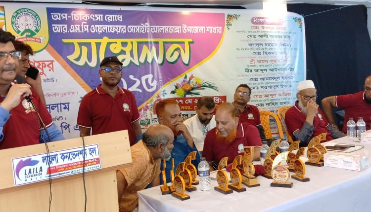 আলমডাঙ্গা ব্যুরো: অপচিকিৎসা রোধ ও সদস্যদের কল্যাণে সচেতনতা বৃদ্ধির লক্ষ্যে আরএমপি ওয়েলফেয়ার সোসাইটির আলমডাঙ্গা উপজেলা শাখার সম্মেলন ২০২৫’ অনুষ্ঠিত হয়েছে। গতকাল শনিবার বেলা সাড়ে ১১টায় আলমডাঙ্গা শহরের হাজি মোড়ে ডা. লিয়াকত টাওয়ারস্থ লায়লা কনভেনশন হলে আলমডাঙ্গা উপজেলা শাখার আয়োজনে এ সম্মেলন অনুষ্ঠিত হয়। সম্মেলনের উদ্বোধন করেন সংগঠনের কেন্দ্রীয় কমিটির সভাপতি আলহাজ্ব এম এ গফুর। আলমডাঙ্গা উপজেলা শাখার আহ্বায়ক ও বিসিডিএস আলমডাঙ্গা উপজেলার নির্বাহী সদস্য জাকেরুল ইসলামের সভাপতিত্বে প্রধান অতিথি ছিলেন চুয়াডাঙ্গা জেলা ঔষধ পরিদর্শক তাহমিদ জামিল। প্রধান আলোচক হিসেবে বক্তব্য দেন সংগঠনের কেন্দ্রীয় মহাসচিব আলহাজ্ব আমিনুল ইসলাম। বিশেষ অতিথি ছিলেন আলমডাঙ্গা থানার অফিসার ইনচার্জ মাসুদুর রহমান (পি.পি.এম), চুয়াডাঙ্গা জেলা শাখার বিসিডিএস সভাপতি মাসুদুর রহমান। সম্মেলনে সর্বসম্মতিক্রমে জাকেরুল ইসলামকে সভাপতি ও জহুরুল ইসলামকে সাধারণ সম্পাদক নির্বাচিত করে ৯৬ সদস্য বিশিষ্ট আরএমপি ওয়েলফেয়ার সোসাইটি, আলমডাঙ্গা উপজেলা শাখার নতুন কমিটি ঘোষণা করা হয়। অনুষ্ঠানে সংগঠনের আলমডাঙ্গা উপজেলা শাখার যুগ্ম আহ্বায়ক জহিরুল ইসলাম ও ইলিয়াস হোসেনের উপস্থাপনায় উপস্থিত ছিলেন সংগঠনের কেন্দ্রীয় কমিটির সিনিয়র সহ-সভাপতি জগলুর রহমান লিটন, সাংগঠনিক সম্পাদক হেকমত আলী, চুয়াডাঙ্গা জেলা শাখার সভাপতি ফজলুর রহমান, বিসিডিএস আলমডাঙ্গা উপজেলা শাখার সভাপতি আলী আকবর কাকু, জেলা শাখার উপদেষ্টা শ্রী অমল কুমার বিশ্বাস, সিনিয়র সহ-সভাপতি মীর আব্দুল আউয়াল লিডু, সহ-সভাপতি জামসেদুল ইসলাম, সাধারণ সম্পাদক নওশাদুল ইসলাম, সাংগঠনিক সম্পাদক আব্দুল আজিজ এবং আলমডাঙ্গা উপজেলা প্রেসক্লাবের সাধারণ সম্পাদক নাজমুল হক শাওন, দপ্তর সম্পাদক শরিফুল ইসলাম রোকন। বক্তারা তাদের বক্তব্যে সমাজে অপচিকিৎসা রোধে সকল শ্রেণি-পেশার মানুষকে সচেতন হওয়ার আহ্বান জানান এবং সংগঠনের কার্যক্রম আরও গতিশীল করার প্রত্যয় ব্যক্ত করেন। উল্লেখ্য, আরএমপি ওয়েলফেয়ার সোসাইটি সদস্যদের পারস্পরিক সহায়তা, প্রশিক্ষণ ও সেবার মানোন্নয়নে কাজ করে যাচ্ছে।