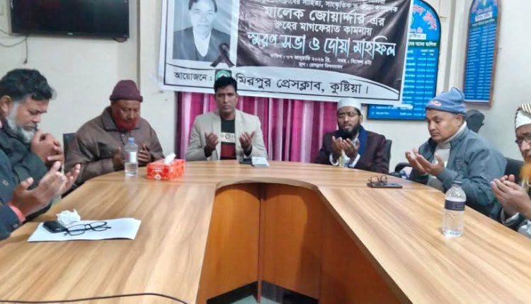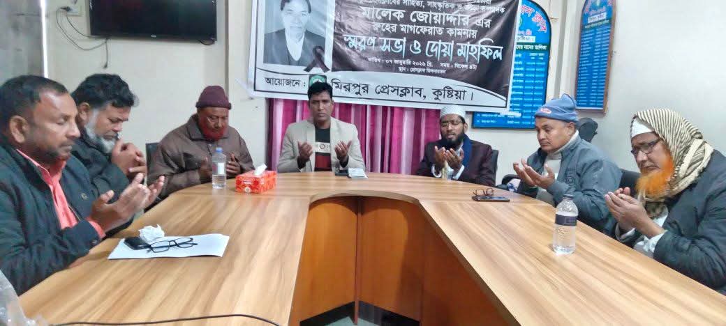 কুষ্টিয়ার মিরপুর প্রেস ক্লাবের সাহিত্য ক্রীড়া ও সাংস্কৃতিক সম্পাদক আব্দুল মালেক জোয়ারদারের রুহের মাগফিরাত কামনায় মিরপুর প্রেসক্লাবে স্মৃতিচারণ ও দোয়ার মাহফিল অনুষ্ঠিত হয়েছে