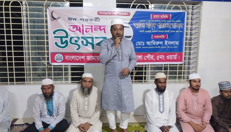 স্টাফ রিপোর্টার: চুয়াডাঙ্গা পৌর ৫ নং ওয়ার্ডে জামায়াতে ঈদ আনন্দ উৎসব অনুষ্ঠিত হয়েছে। গতকাল শুক্রবার ইসলামপাড়া গোরস্থান মসজিদে আয়োজিত অনুষ্ঠানে সভাপতিত্ব করেন সভাপতি আমিরুল ইসলাম। প্রধান অতিথি ছিলেন চুয়াডাঙ্গা জেলা জামায়াতের সহকারী সেক্রেটারি অ্যাড. মাসুদ পারভেজ রাসেল। তিনি বলেন, বাংলাদেশকে সুখী এবং সমৃদ্ধ সোনার বাংলা গড়তে হলে দুর্নীতিকে রুখে দিতে হবে। দেশের অবকাঠামো উন্নয়নের ক্ষেত্রে দুর্নীতি রোধ করতে পারলে টেকসই উন্নয়ন সম্ভব। বাংলাদেশ জামায়াতে ইসলামী দুর্নীতিমুক্ত সোনার বাংলা গড়তে চাই। বিশেষ অতিথি ছিলেন চুয়াডাঙ্গা পৌর জামায়াতের আমির অ্যাড. হাসিবুল ইসলাম, চুয়াডাঙ্গা পৌর নায়েবে আমির মাহবুব আসিক শফি, সহকারী সেক্রেটারি ইমরান হোসেন ও হুমায়ুন কবীর, পৌর কর্ম পরিষদ সদস্য হাফেজ ইকবাল, দেলোয়ার হোসেন হোসেনসহ ৫ নম্বর ওয়ার্ড বিভিন্ন পর্যায়ের দায়িত্বশীলবৃন্দ।